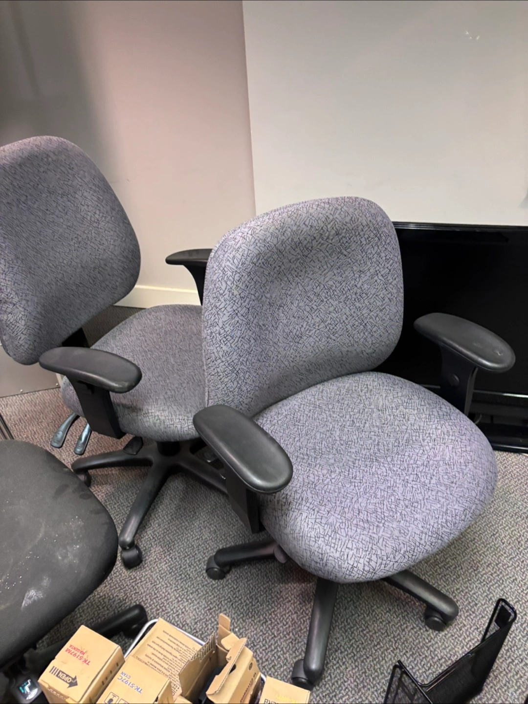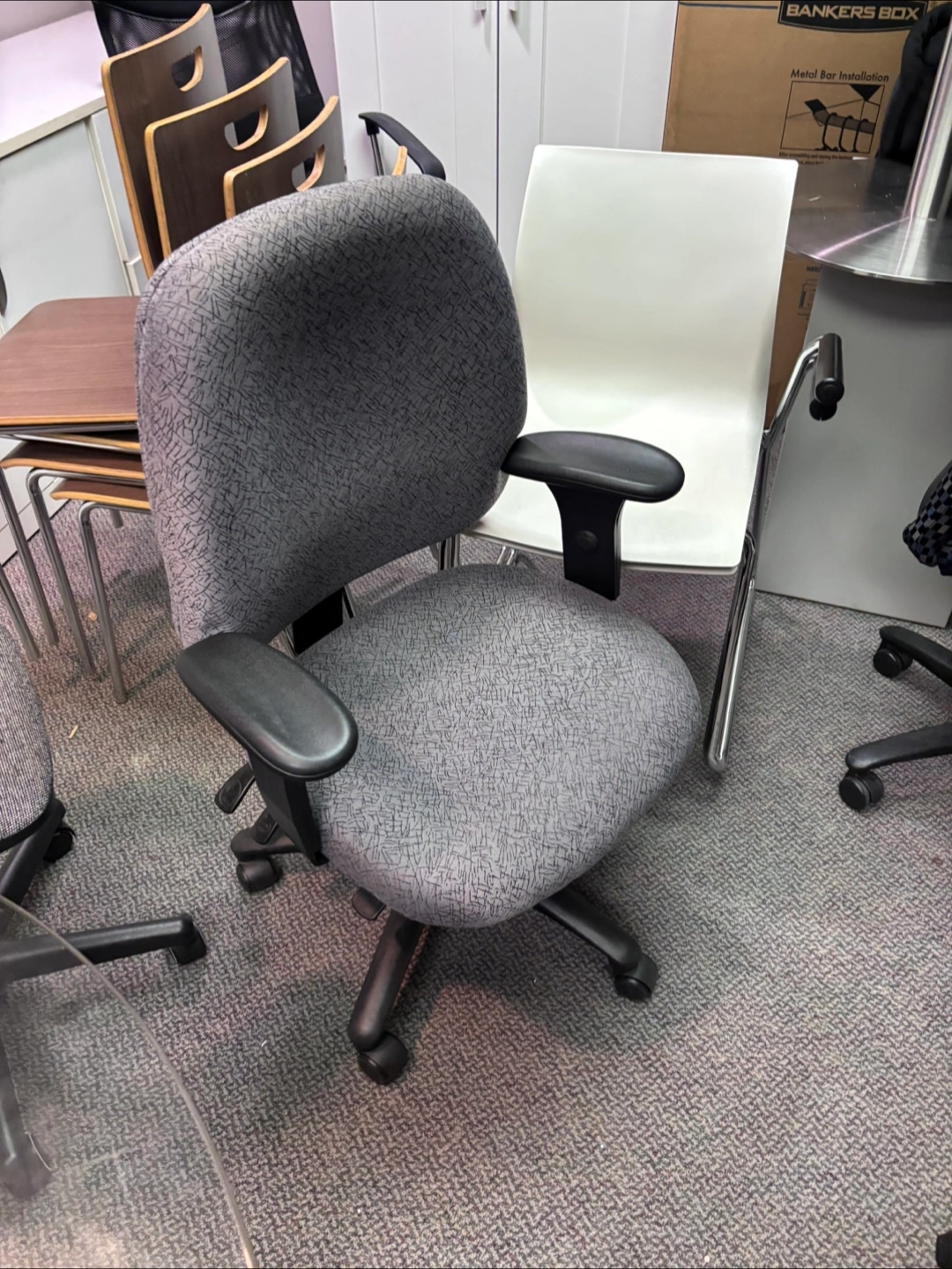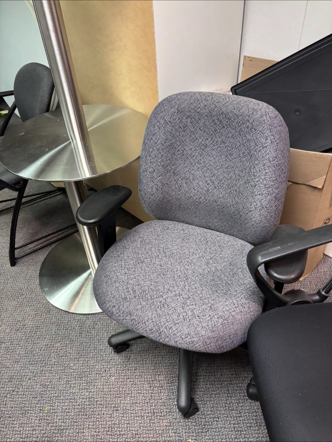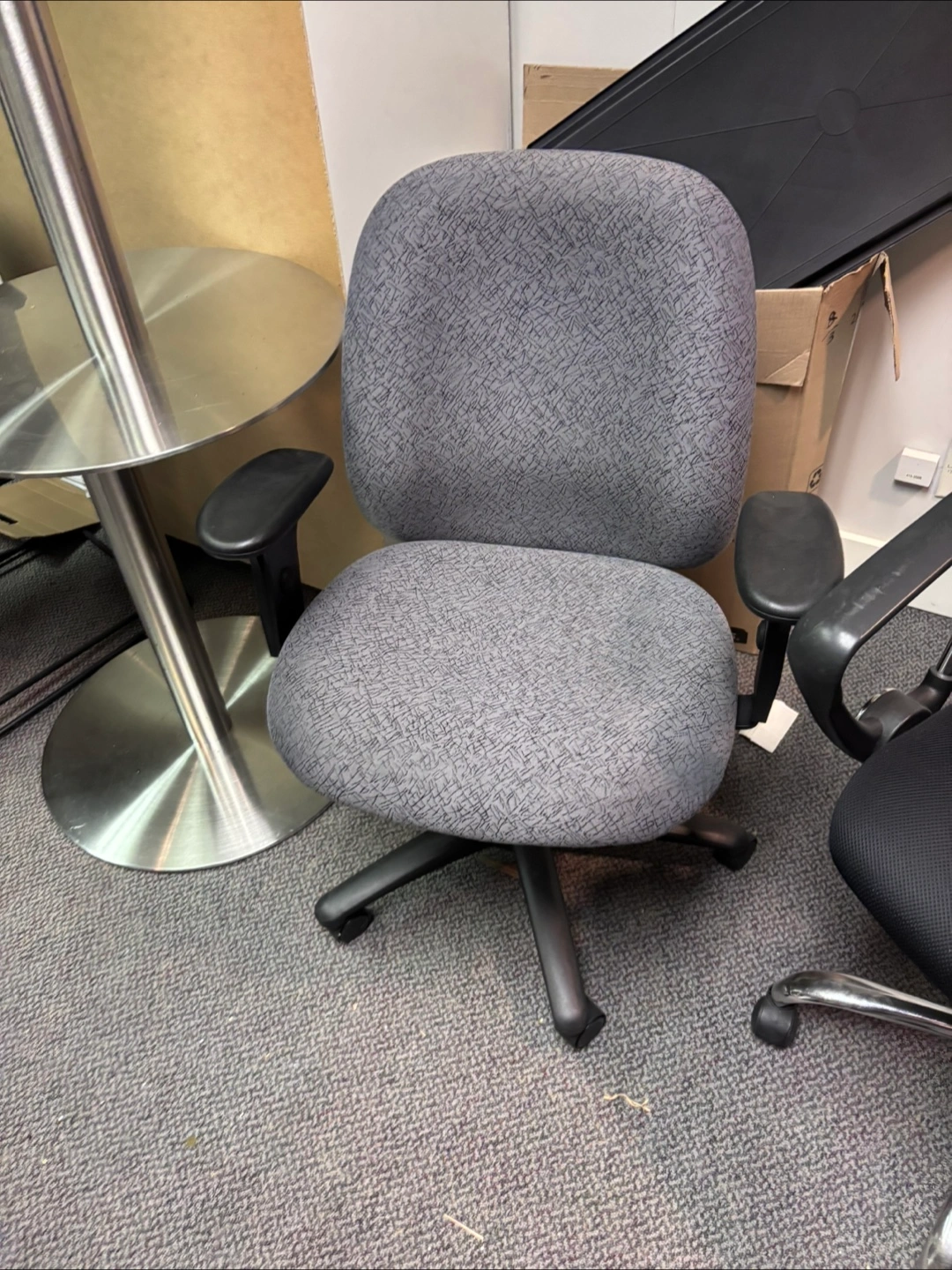 Selling a used office chair in grey. It's in good condition and ready for a new workspace! The chair is comfortable and has adjustable armrests.