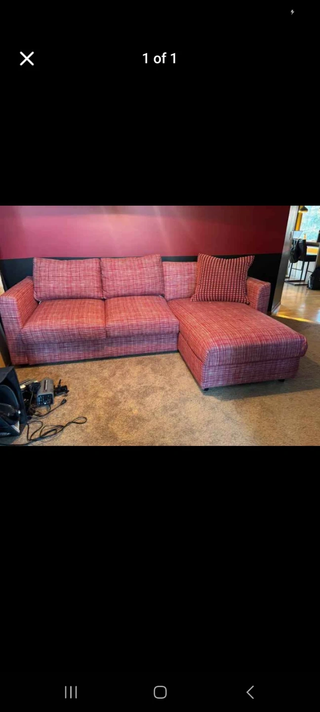 Selling a comfortable sectional sofa with a chaise lounge! It features a red patterned fabric and includes a matching throw pillow. Perfect for a cozy living room setup