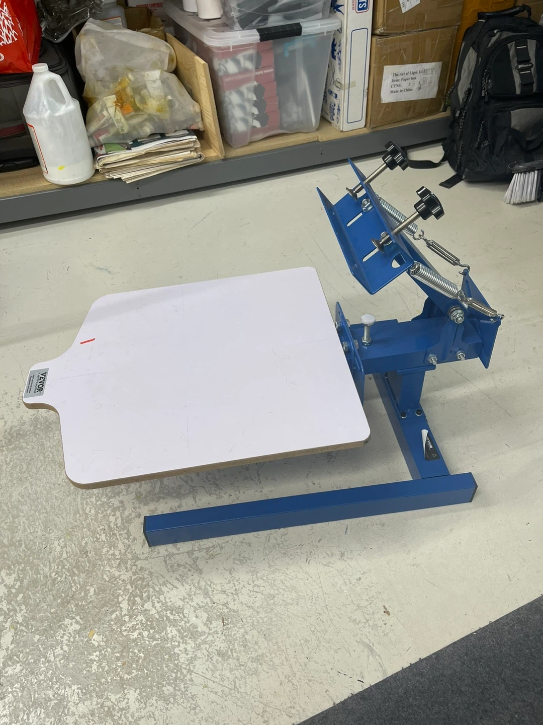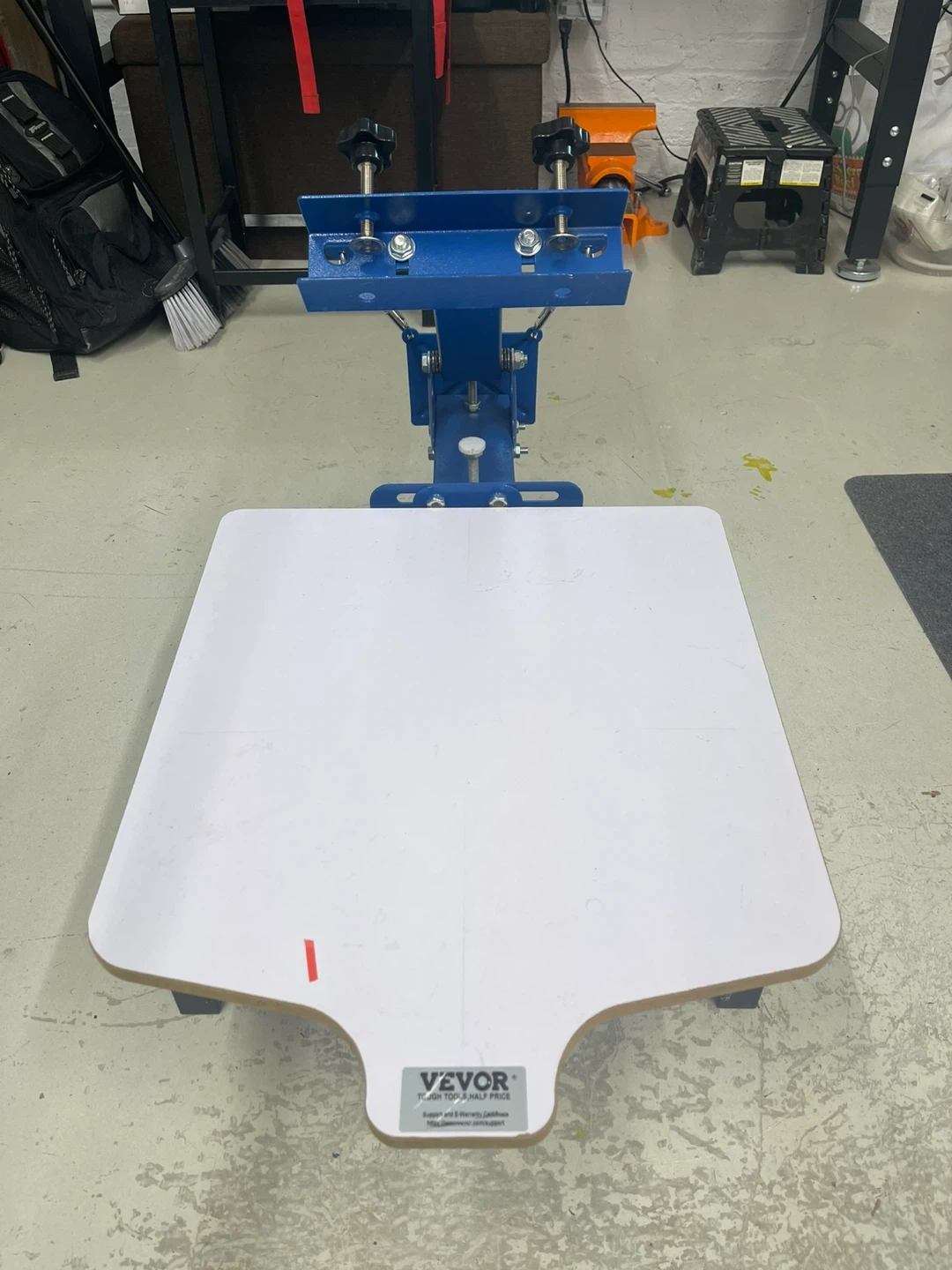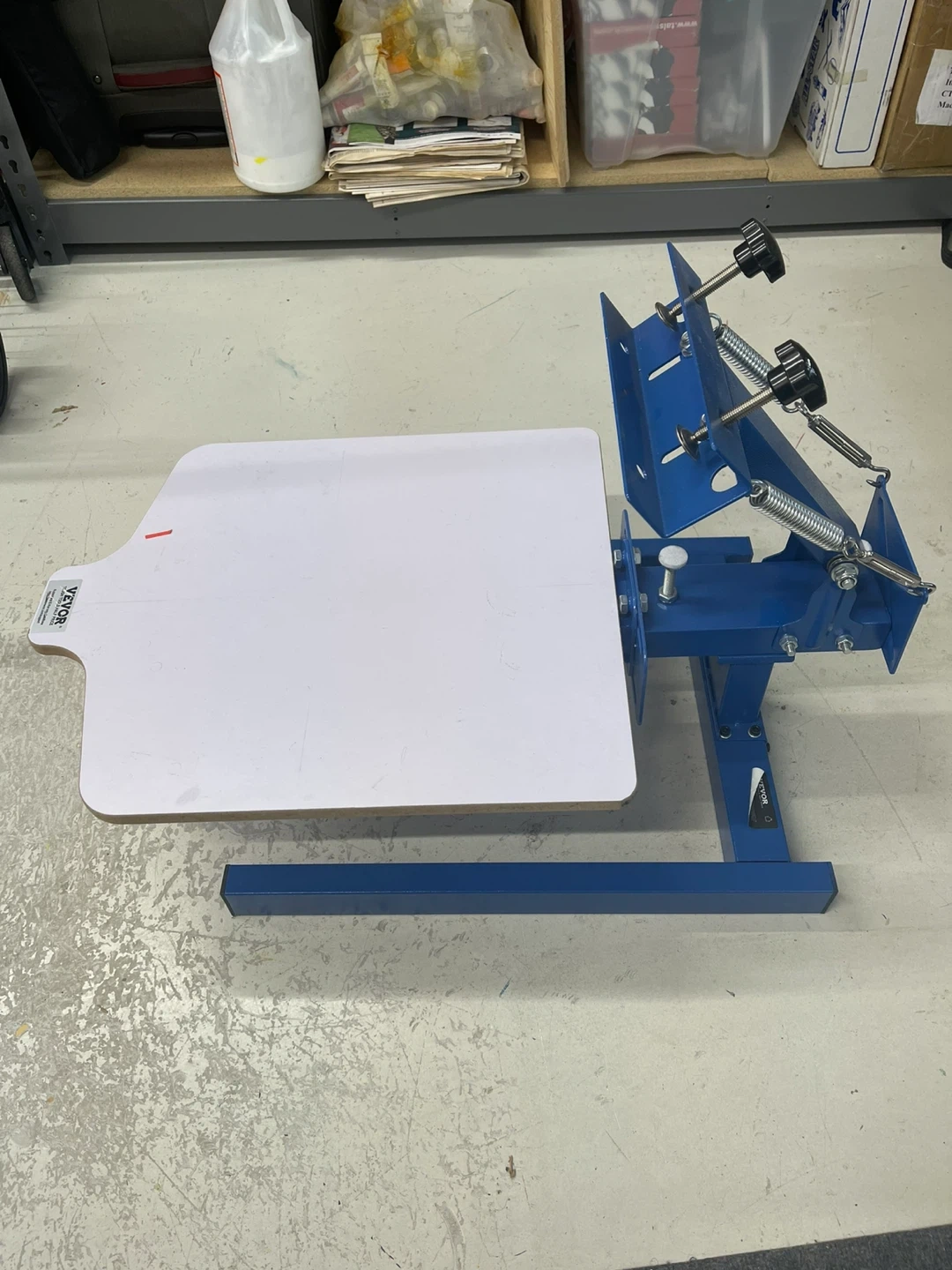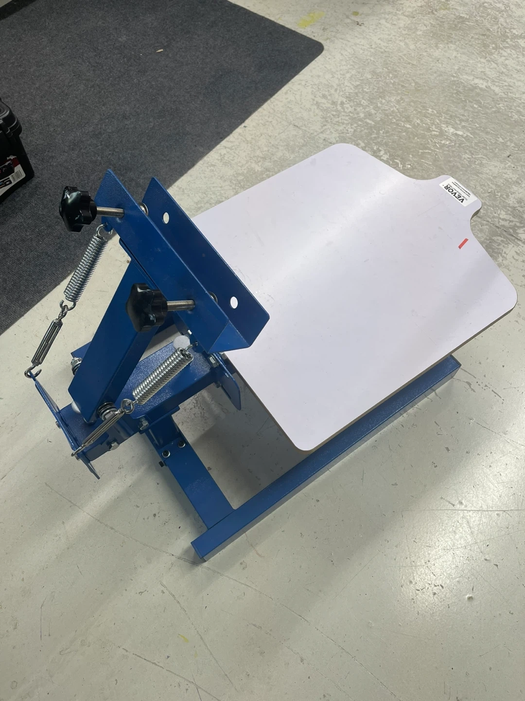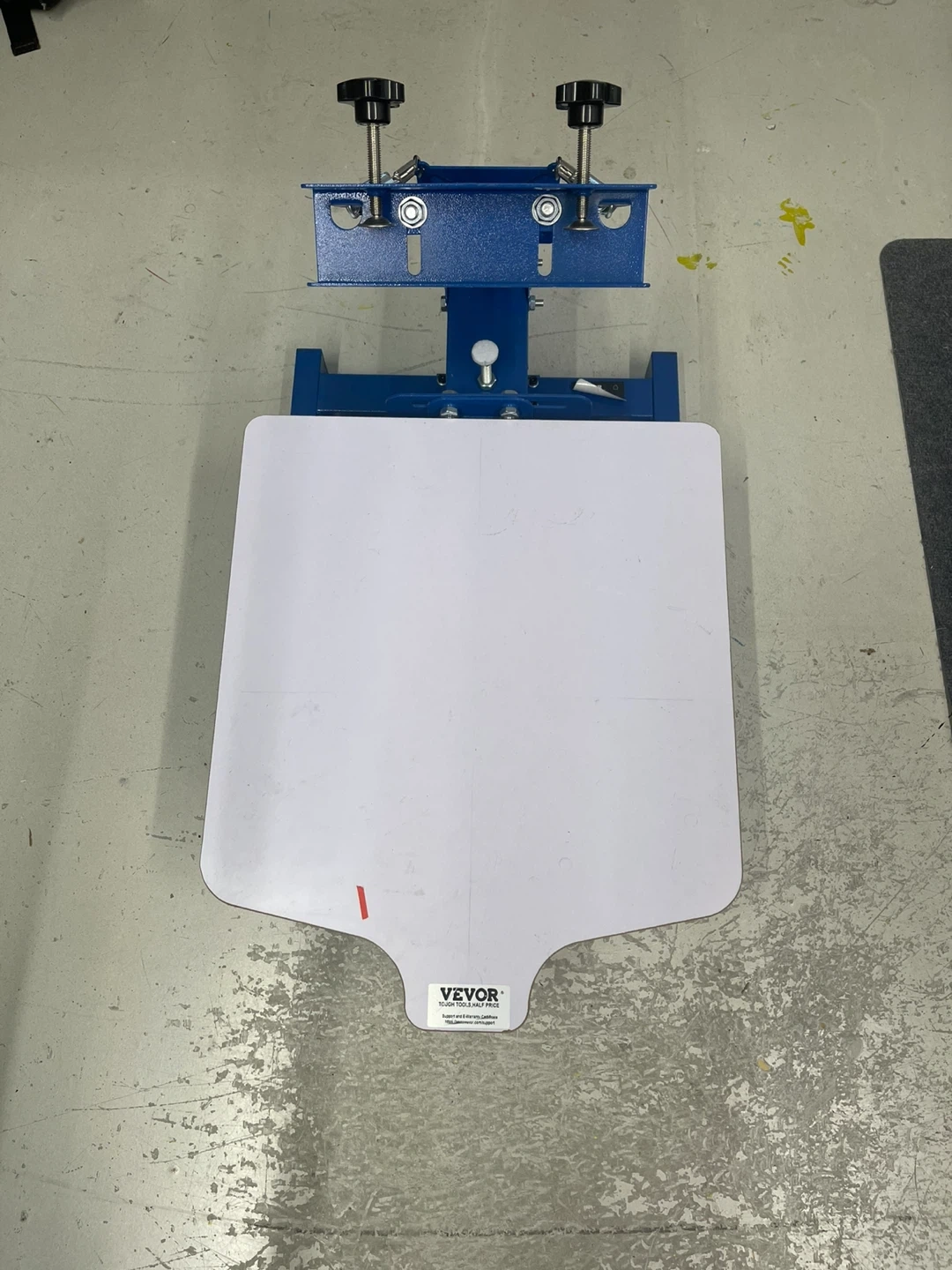 This is a VEVOR screen printing pallet clamp for garment printing. It features a durable blue metal frame and a white printing surface. The adjustable clamp ensures secure screen placement for various printing projects.