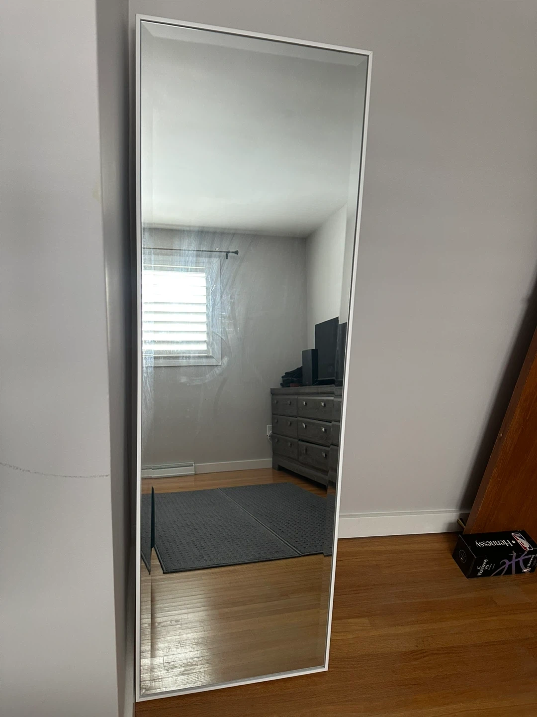 Tall full-length mirror with a clean white frame. It's perfect for checking your outfit before heading out. This mirror adds a functional touch to any room.