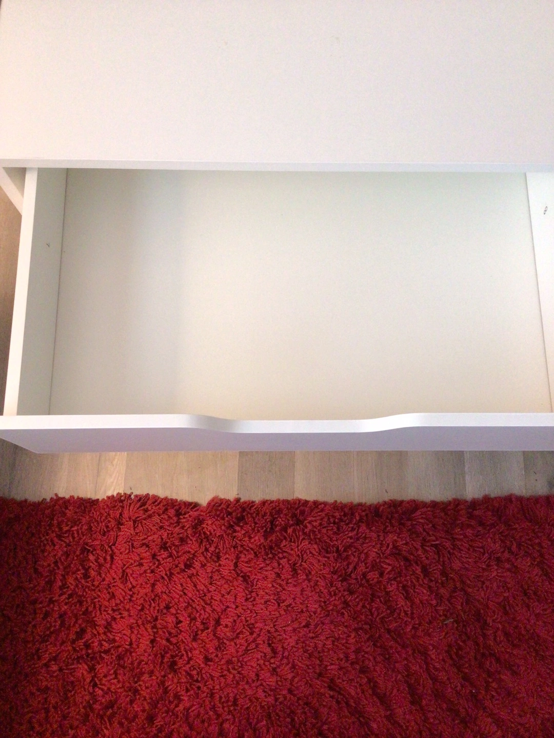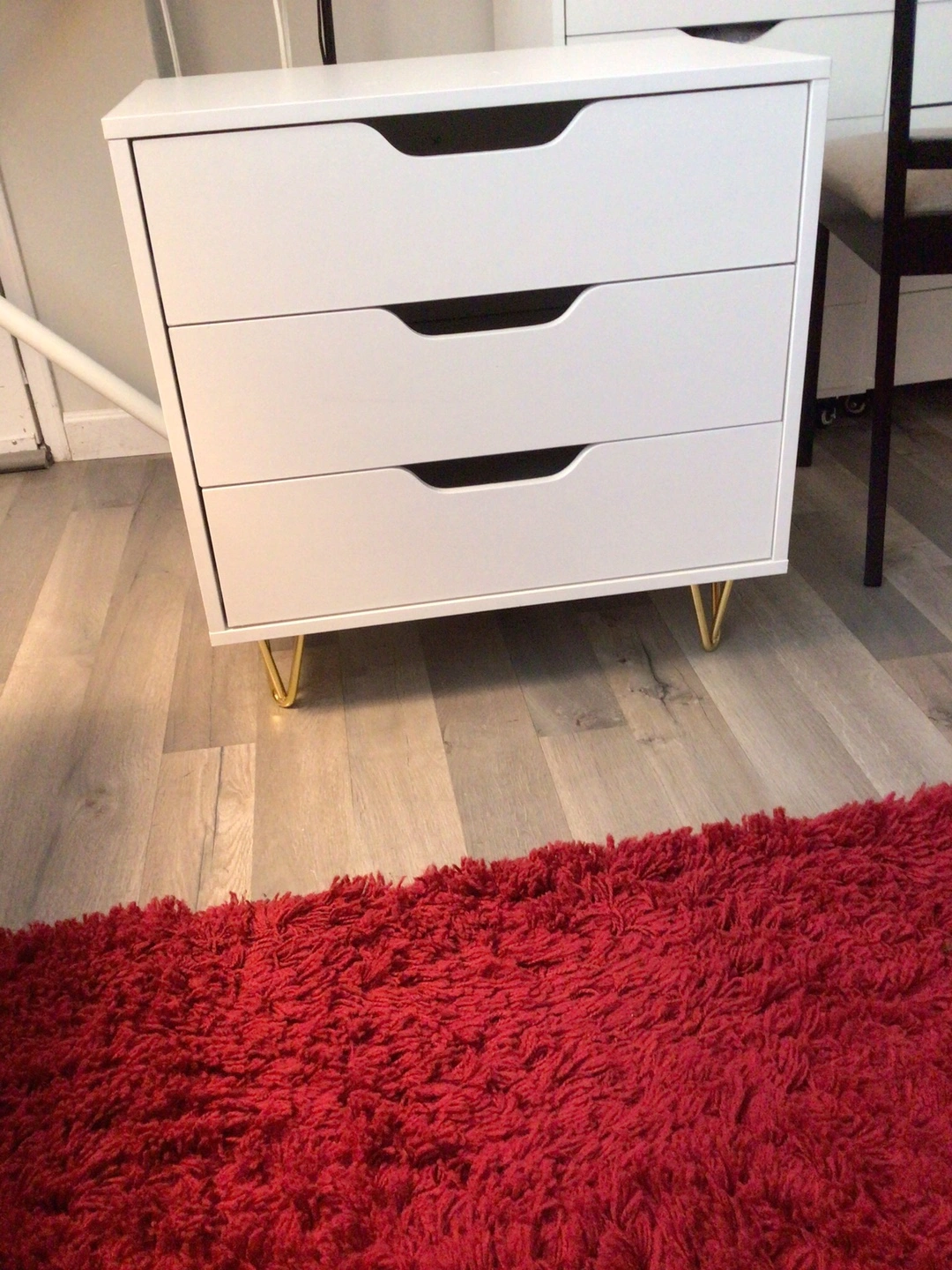 Selling a white dresser with three drawers and gold legs. It's in great condition and perfect for adding storage to any room