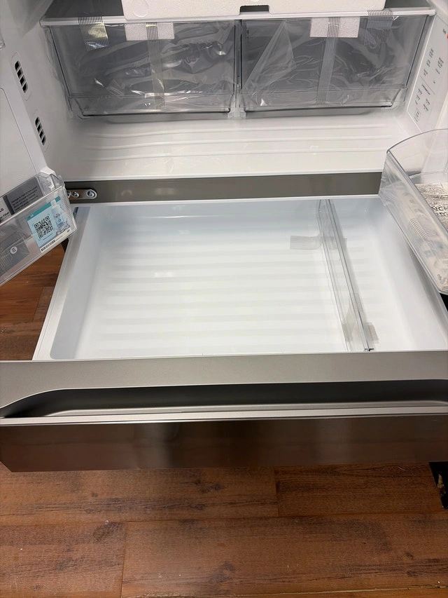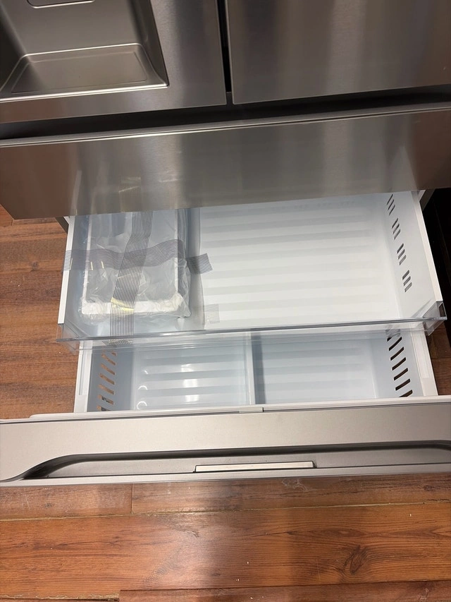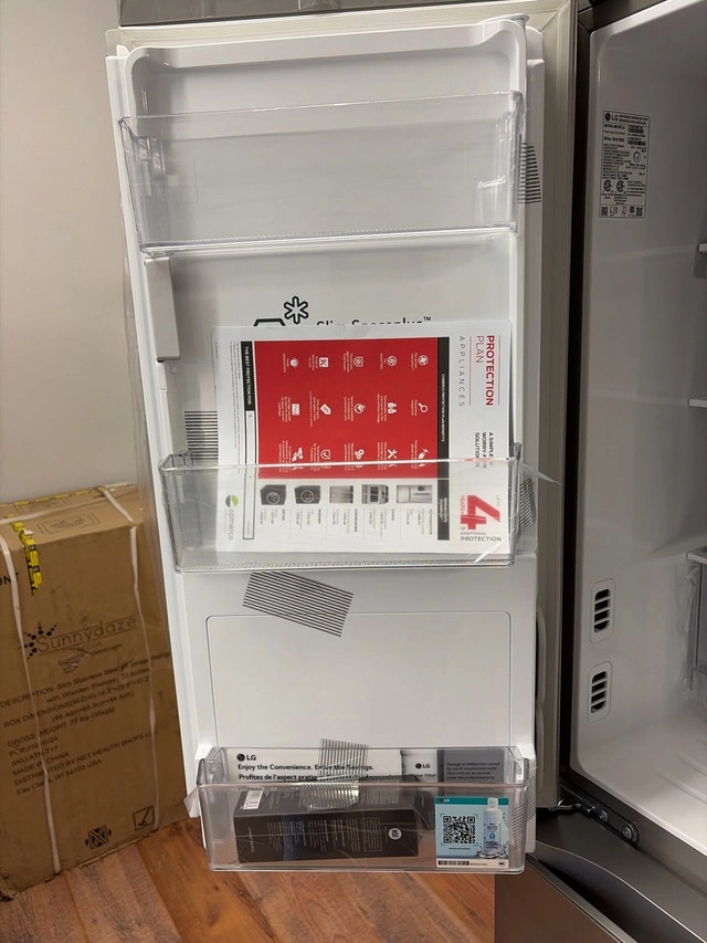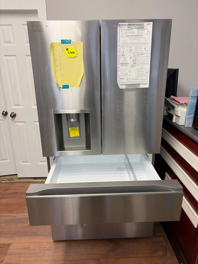 Selling a new scratch and dent 36-inch wide LG fridge, model LF29S8330S. It has a stainless steel finish and a spacious four-door design. Features include a water and ice dispenser, adjustable shelves, and multiple drawers for organization. Please note there are cosmetic imperfections, which are reflected in the price. Specs: 36-inch width, Four-door design, Stainless steel finish, Water and ice dispenser, Adjustable shelves. If the ad is up, the fridge is available. Come and get it! Today only, get $1,500 off this brand new, dented, 36 inch wide LG fridge. We close at 5pm today so come on down!
