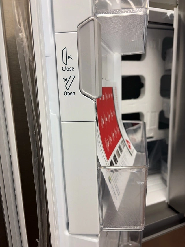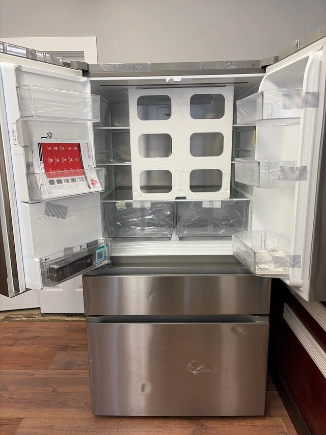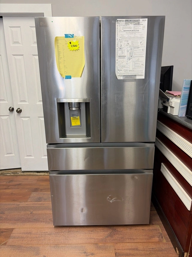 Selling a new scratch and dent 36-inch wide LG fridge, model LF29S8330S. It has a stainless steel finish and a spacious four-door design. Features include a water and ice dispenser, adjustable shelves, and multiple drawers for organization. Please note there are cosmetic imperfections, which are reflected in the price. Specs: 36-inch width, Four-door design, Stainless steel finish, Water and ice dispenser, Adjustable shelves. If the ad is up, the fridge is available. Come and get it! Today only, get $1,500 off this brand new, dented, 36 inch wide LG fridge. We close at 5pm today so come on down!