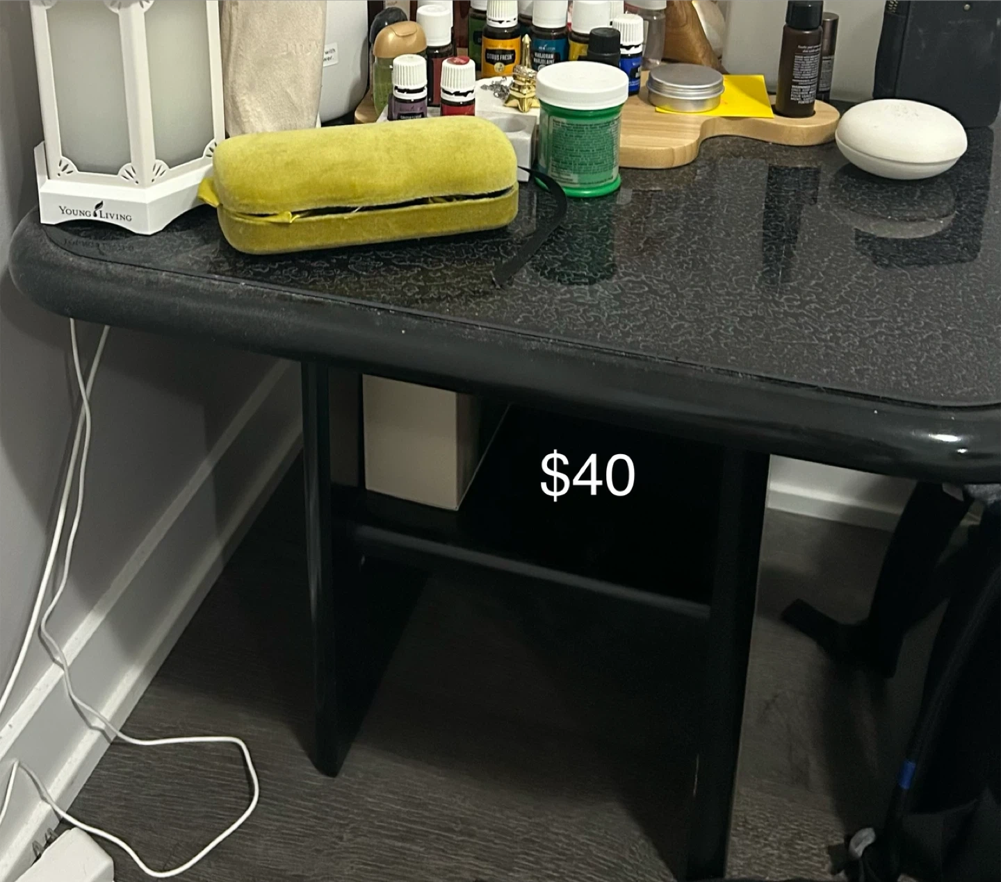 Black speckled side table with a granite-look top. It has a lower shelf for storage. This table's compact size makes it great for small spaces.