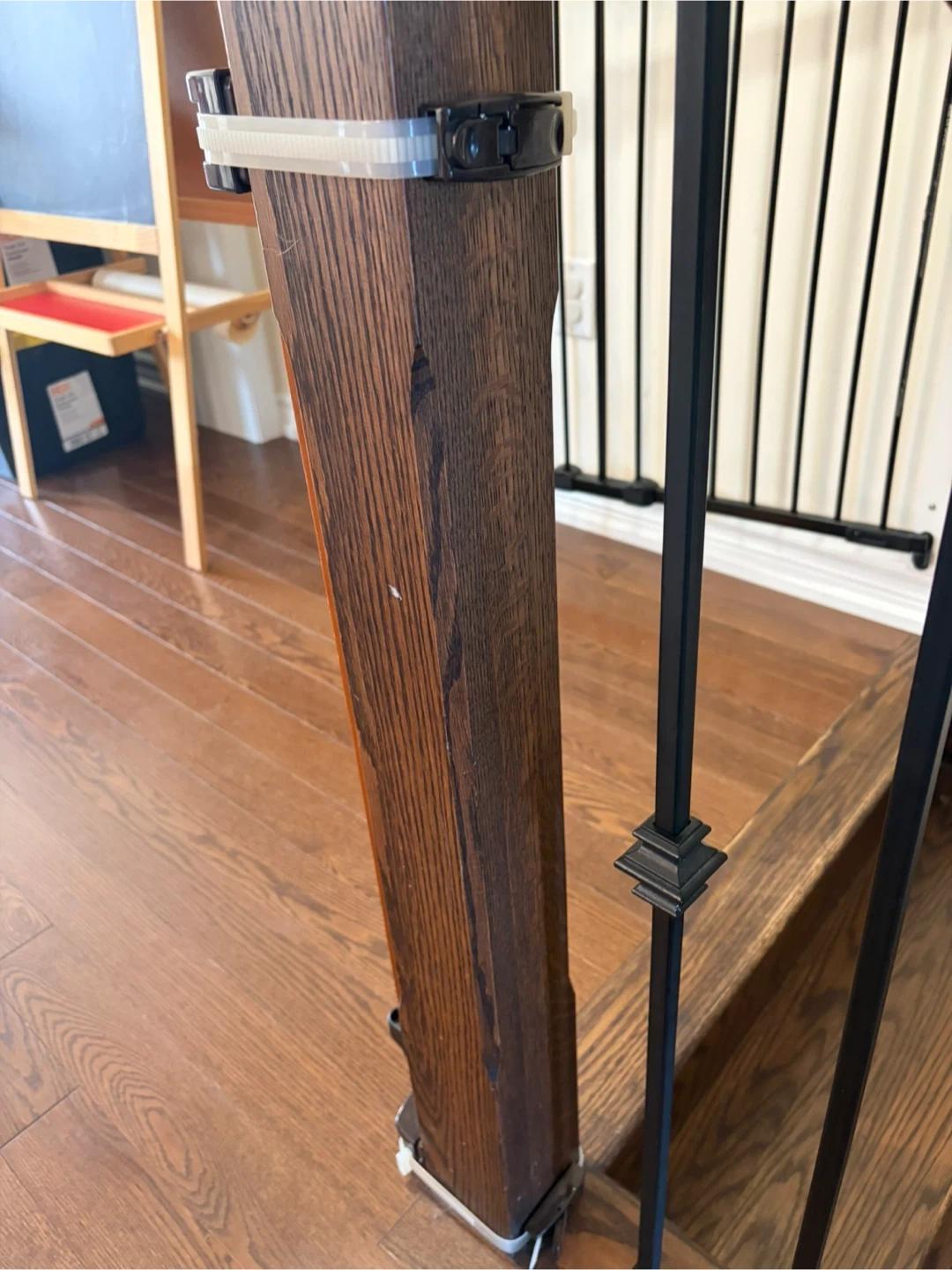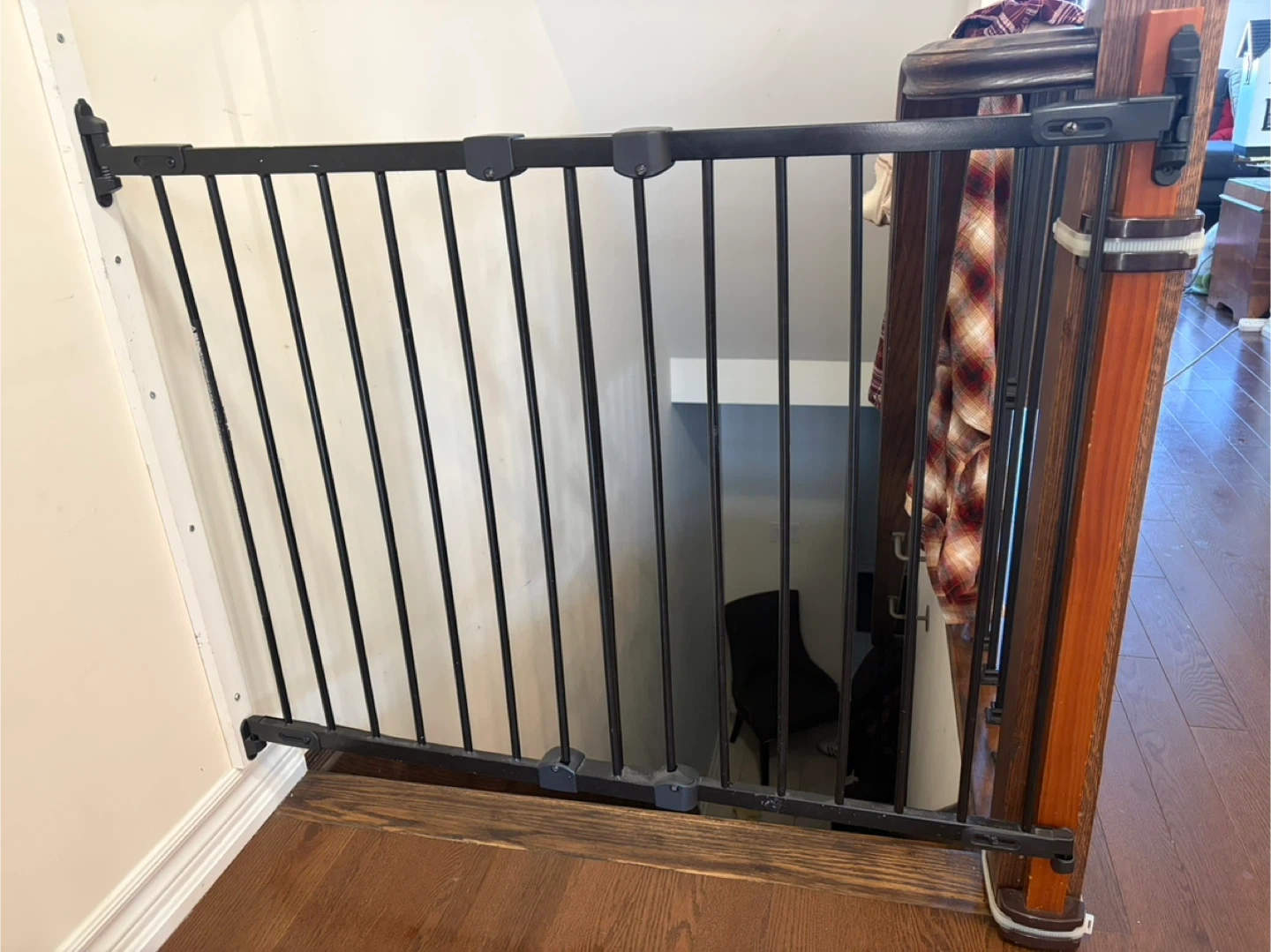 This black metal safety gate is designed for doorways and stairs. It's made of durable metal construction. Mounts securely to walls and banisters. Suitable for keeping pets or little ones contained!