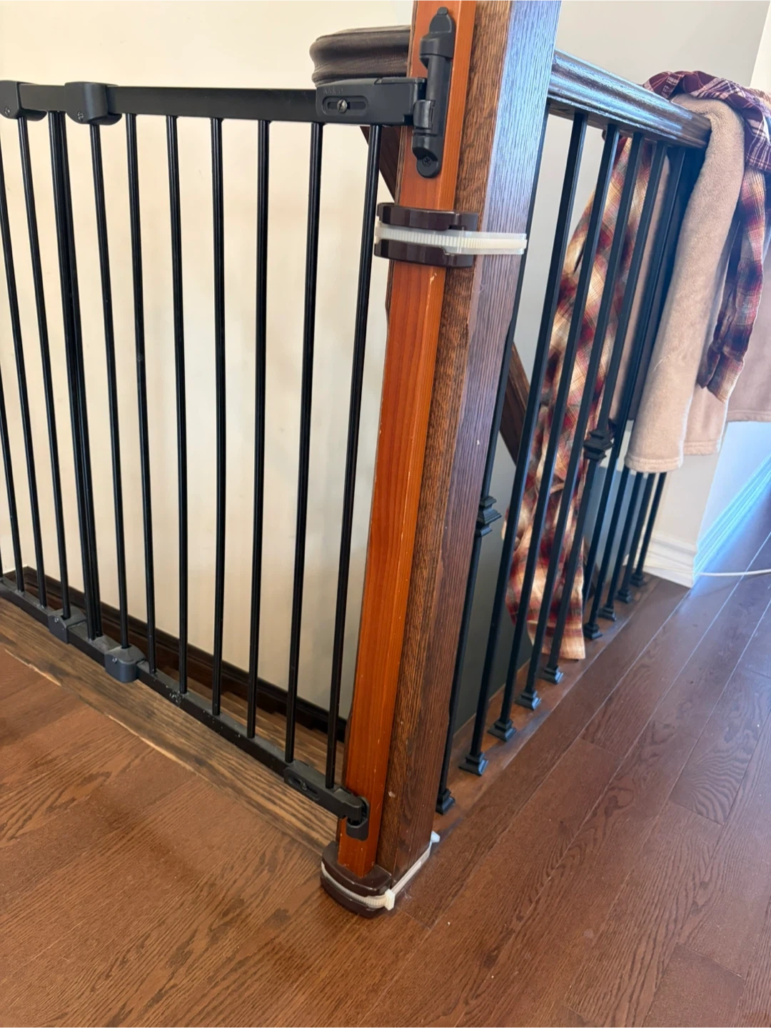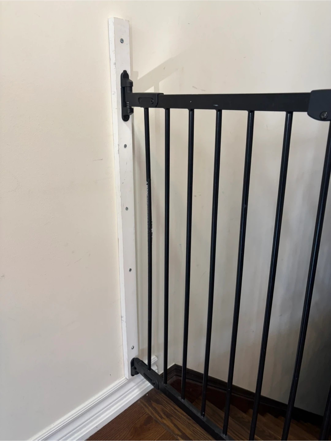 This black metal safety gate is designed for doorways and stairs. It's made of durable metal construction. Mounts securely to walls and banisters. Suitable for keeping pets or little ones contained!