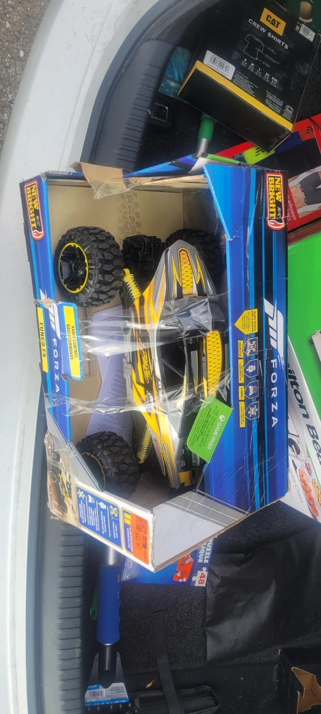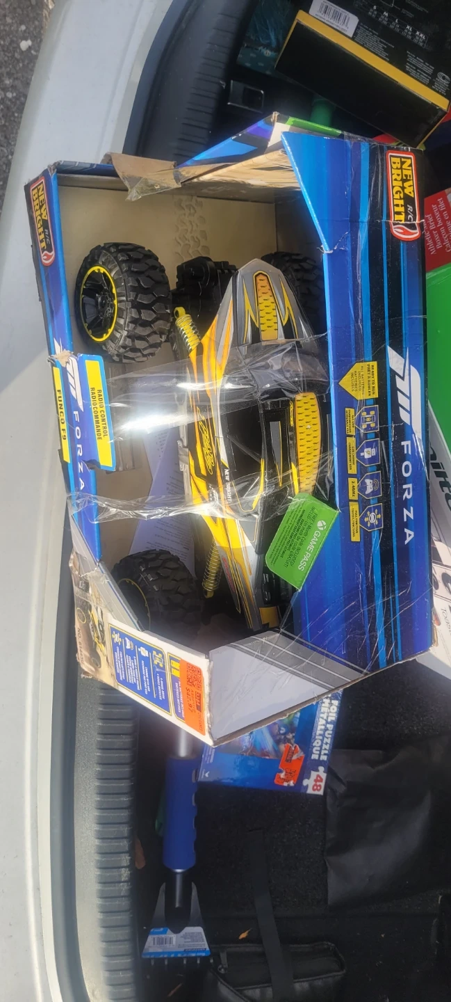 This is a New Bright Forza RC monster truck in yellow and black. It's designed for off-road fun. Great for kids who love remote-controlled vehicles!