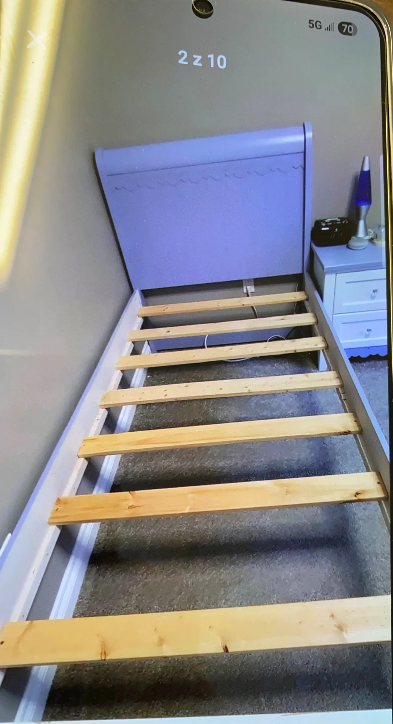 This is a twin-sized bed frame in a lovely shade of purple. It features sturdy wooden slats for mattress support. Perfect for a child's bedroom or guest room!