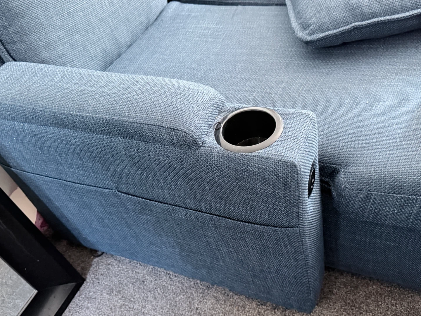 This blue sectional sofa features a recliner and convenient cup holders built into the armrests. It also includes USB charging ports for your devices. Its versatile design makes it a comfy addition to any living space!