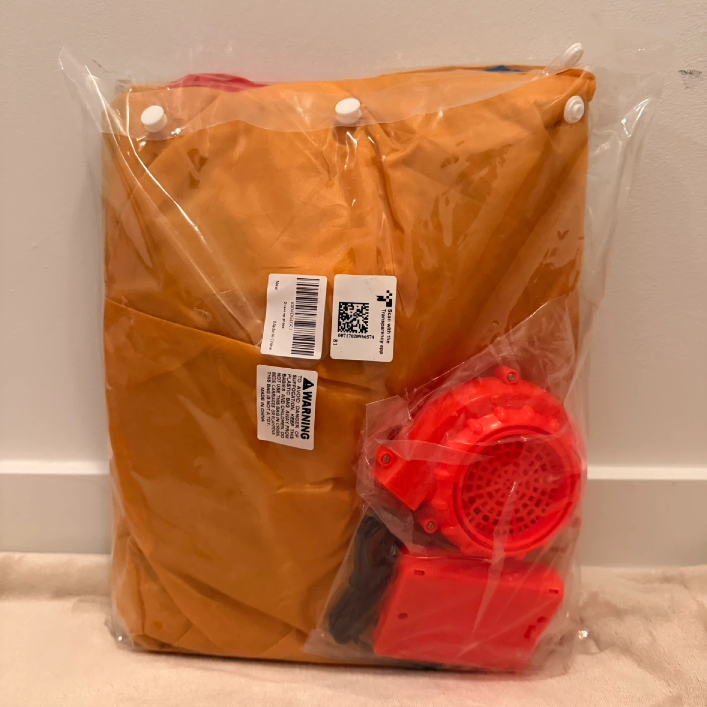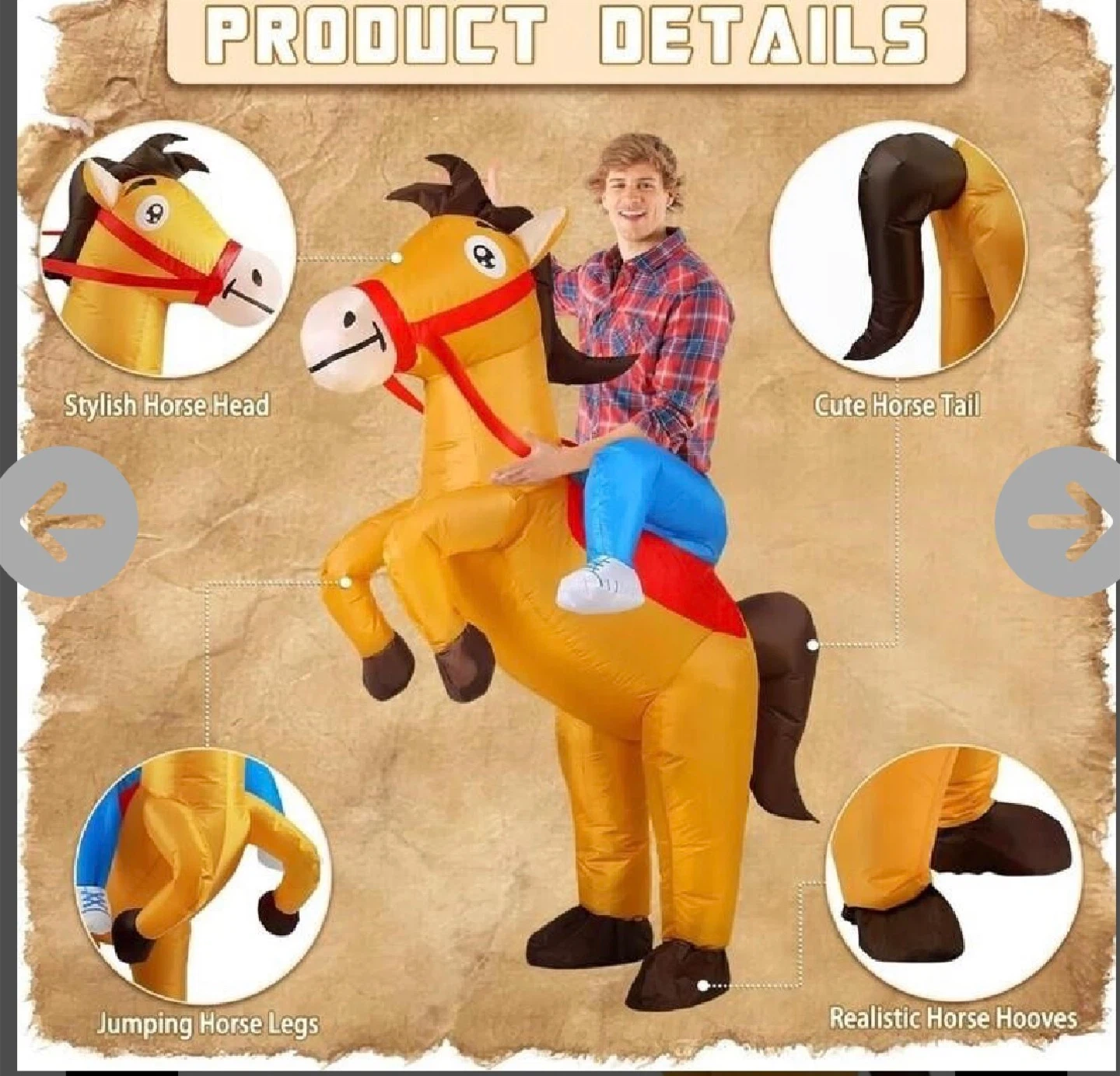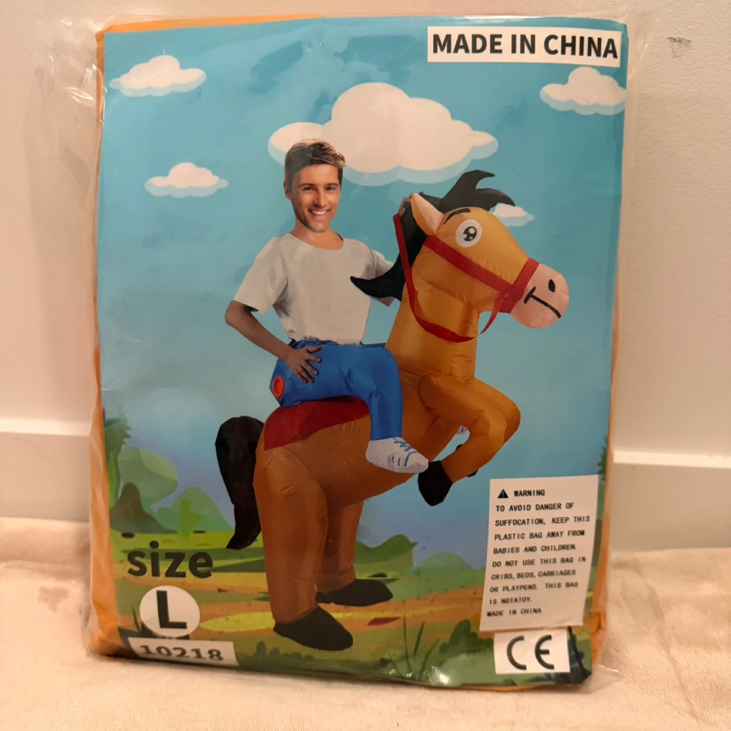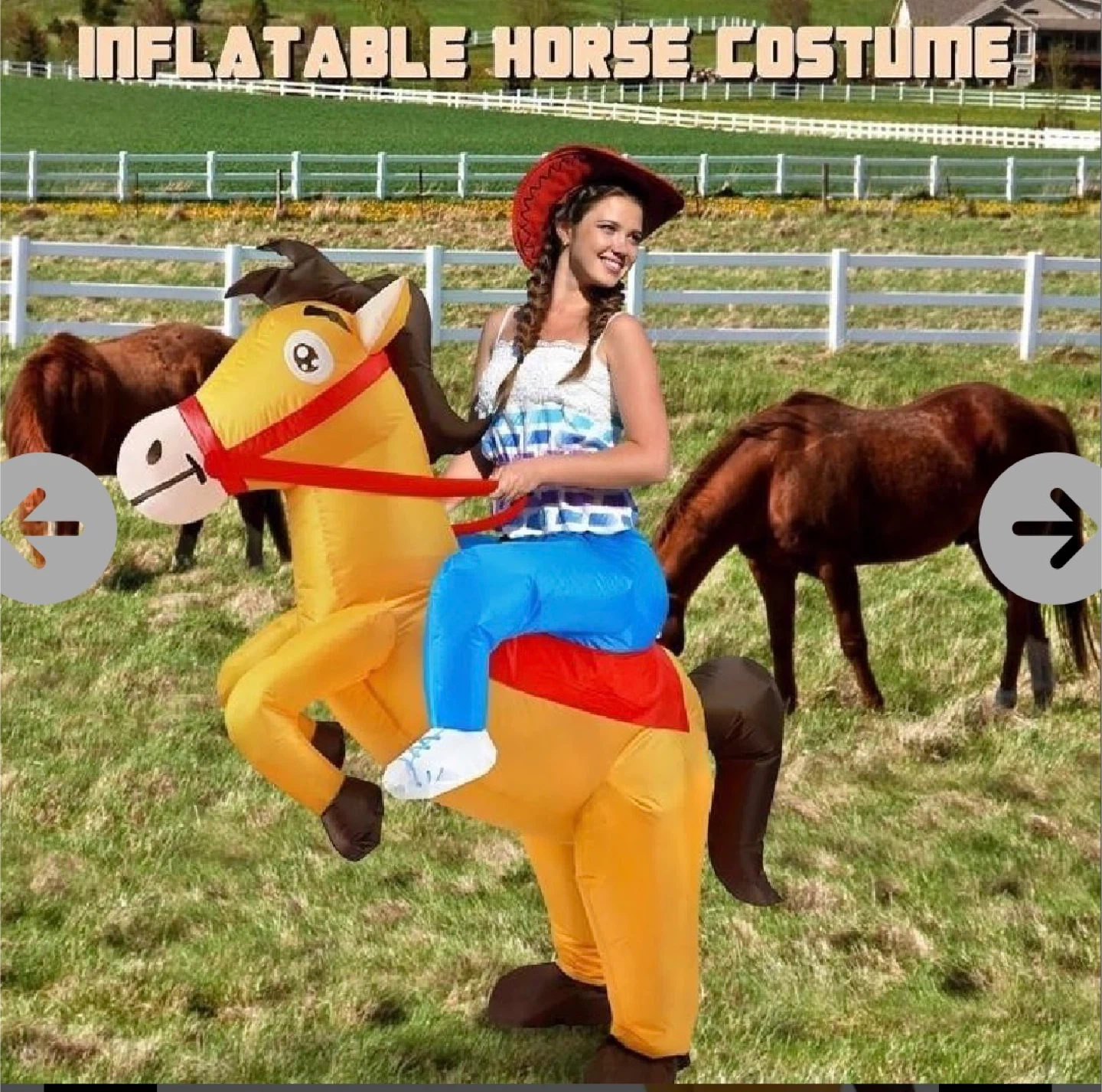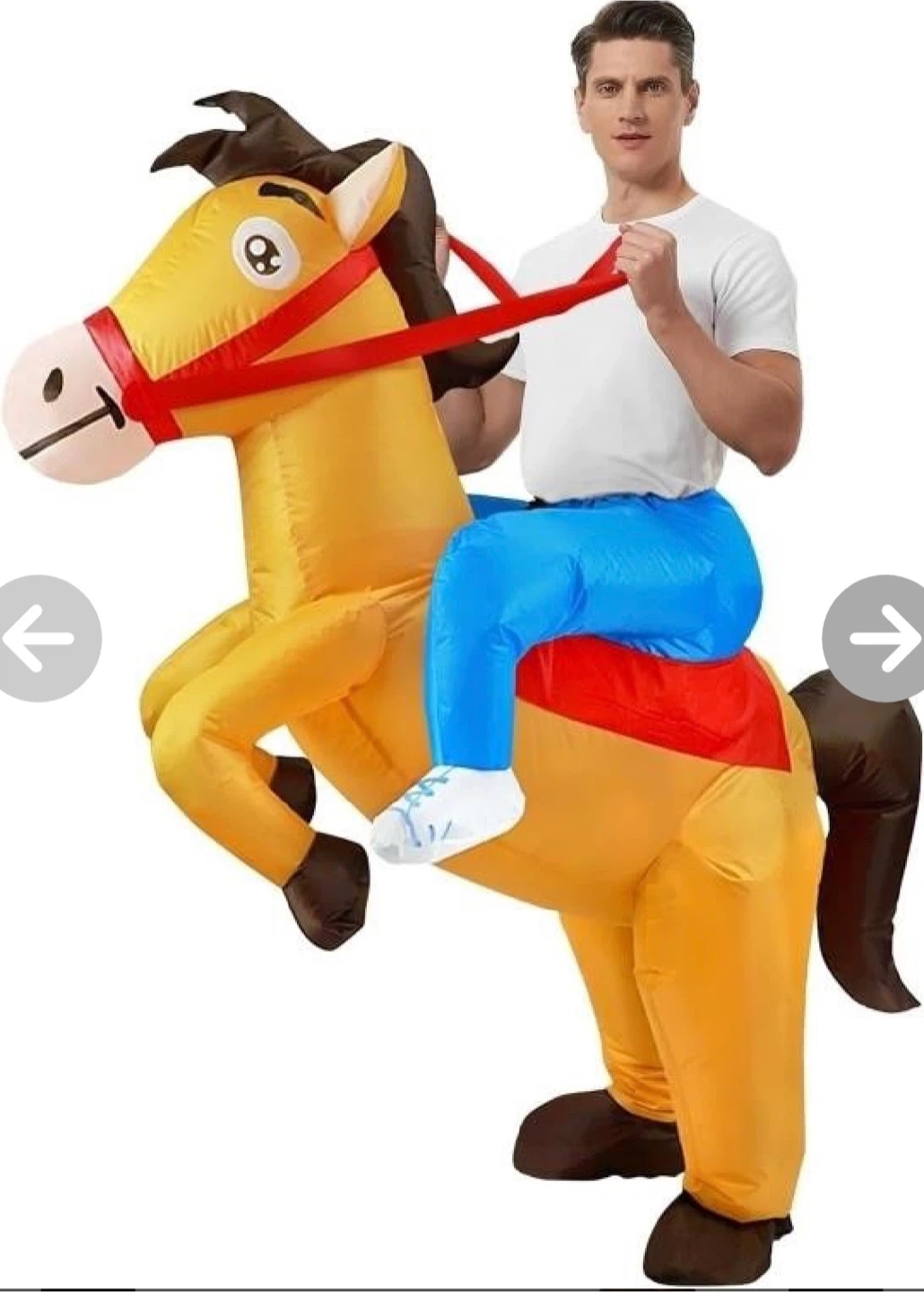 This is a fun inflatable horse costume in yellow and blue. It's a size Large and comes with a fan for inflation. Perfect for parties and Halloween and family fun!