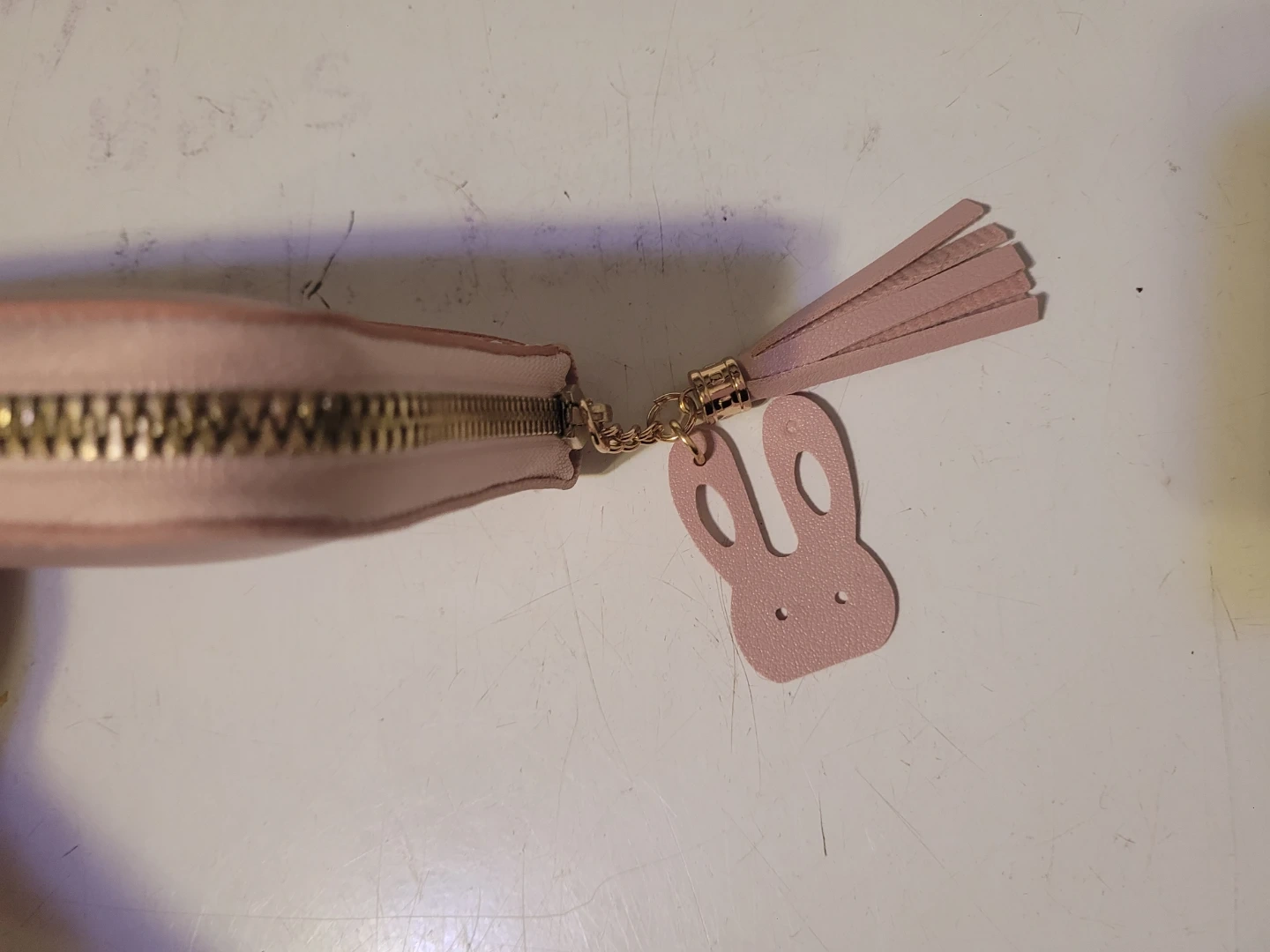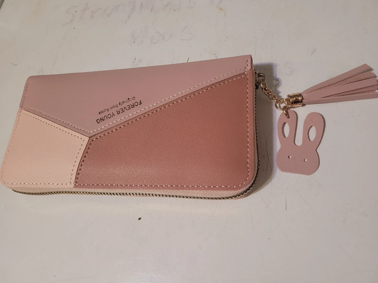 This Forever Young wallet features a stylish colorblock design with pink and brown tones. It has multiple card slots and a zippered coin pocket. It comes with a cute bunny-shaped tassel charm!