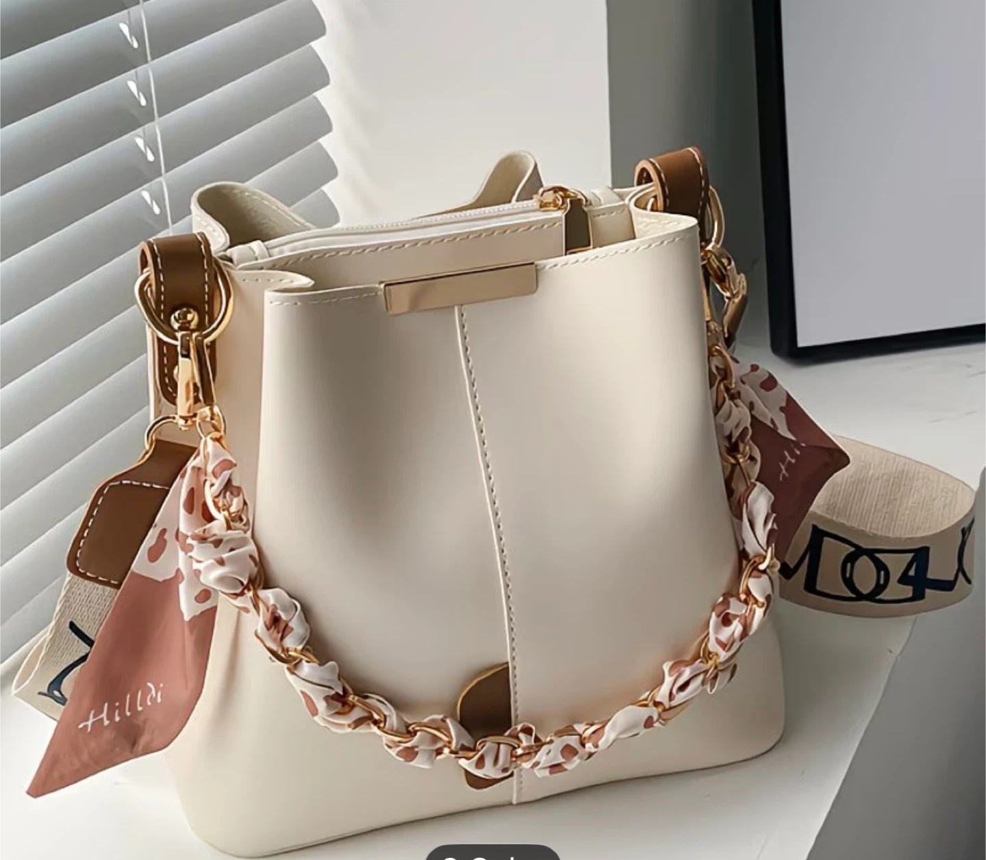 This cream bucket bag features a stylish chain strap adorned with a patterned scarf. It has brown leather accents and a detachable shoulder strap with a printed logo. Dimensions are 22cm x 11cm x 21cm.