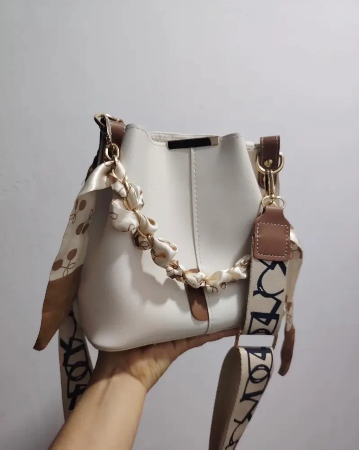 This cream bucket bag features a stylish chain strap adorned with a patterned scarf. It has brown leather accents and a detachable shoulder strap with a printed logo. Dimensions are 22cm x 11cm x 21cm.