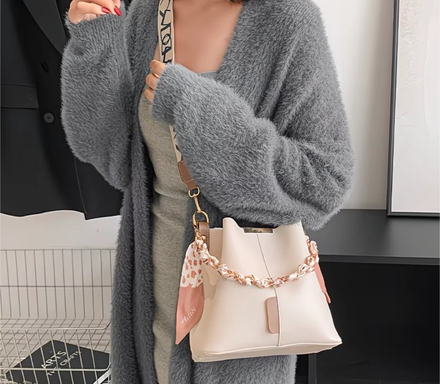 Cream Bucket Bag with Scarf Strap
