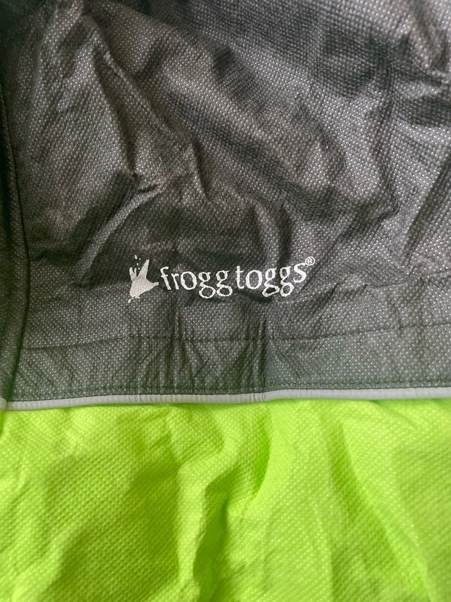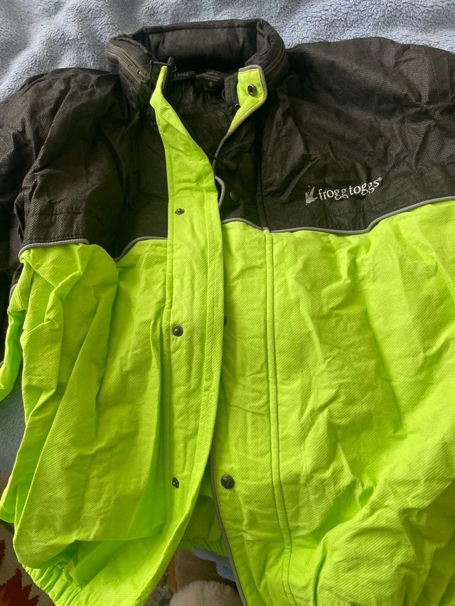 Frogg Toggs rain jacket, size small, never worn, in a vibrant neon green and black. It's perfect for staying dry during rainy days. Brand: Frogg Toggs, Size: Small, Colour: Neon Green / Black, Material: 100%. If the ad is still up, then it is still available! Cash accepted.