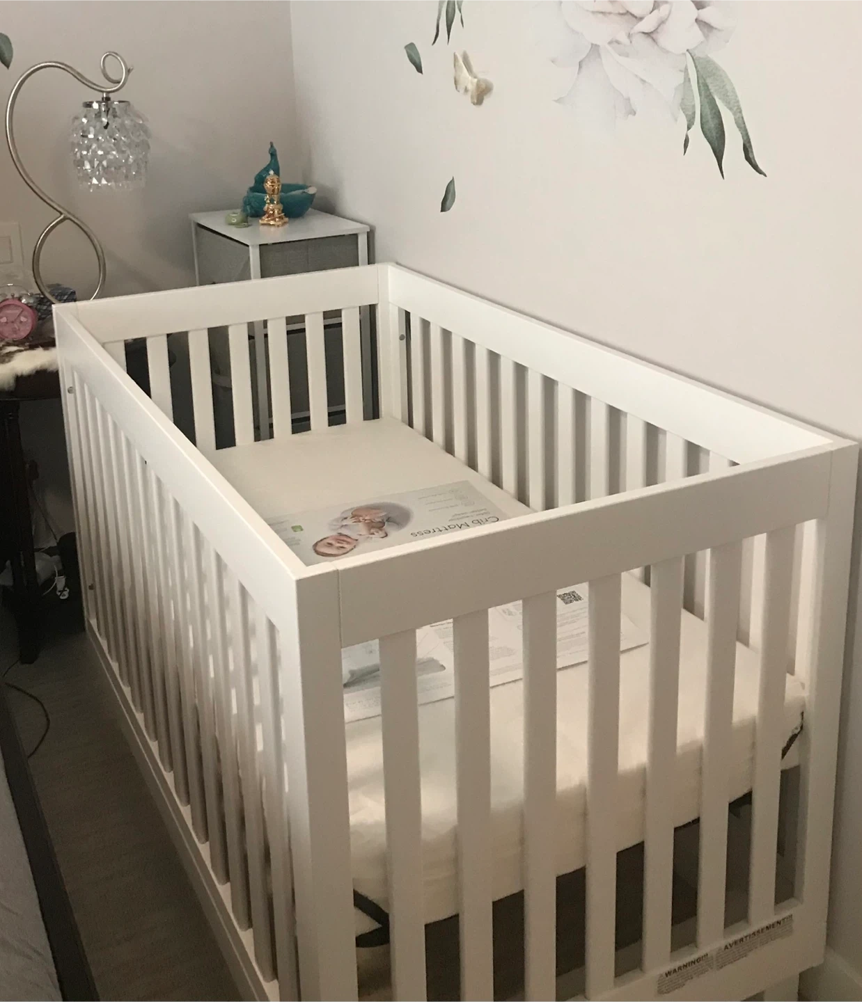 White Modo 3-1 wooden crib with Waterproof crib mattress pad in white with waterproof pad cover.it's 100% breathable and washable. Proven to reduce suffocation risk for babies. Whole set In good condition.disassembled for easy transportation.