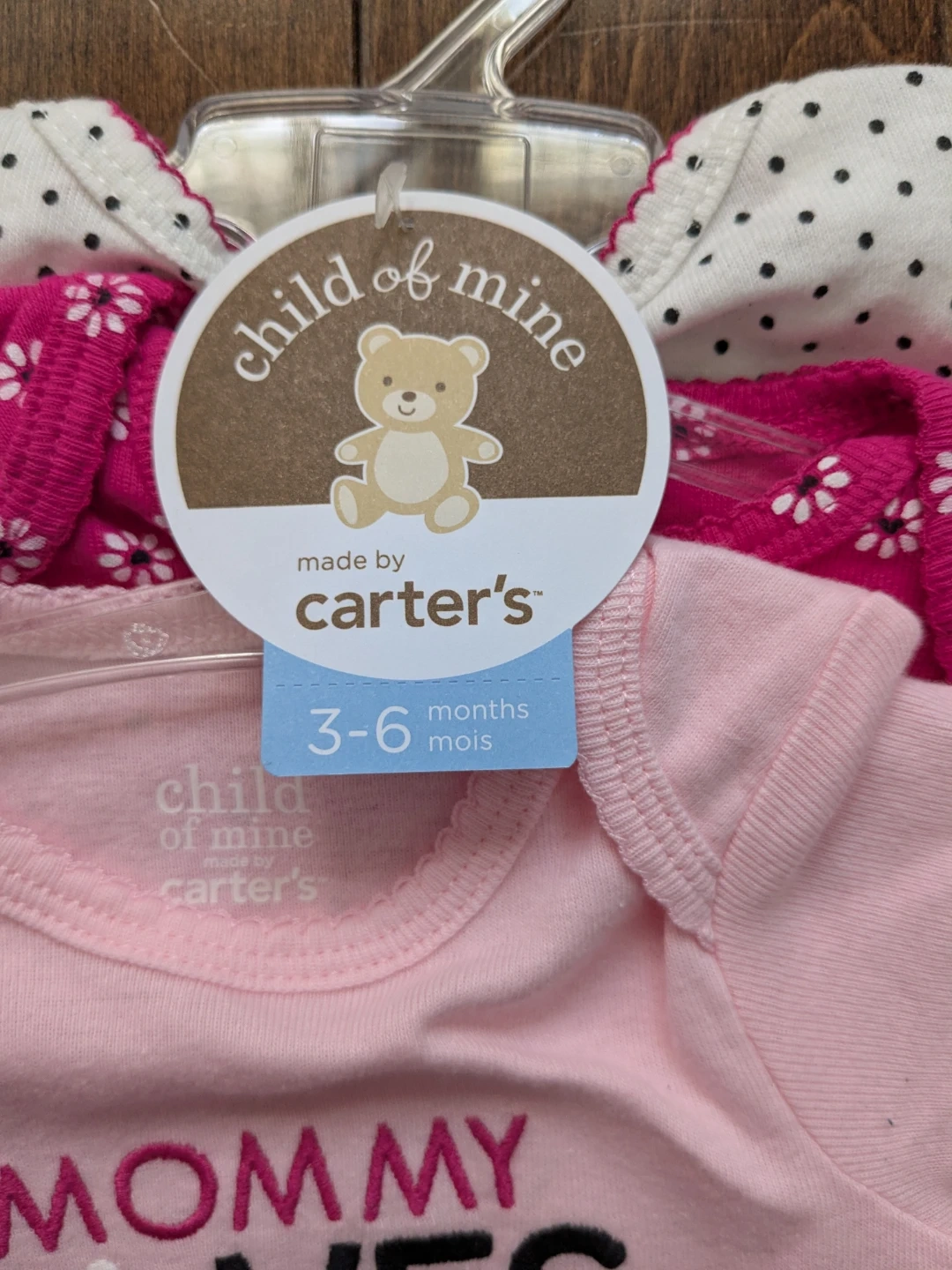 This is a pack of three baby bodysuits from Child of Mine by Carter's. They're sized for 3-6 months.