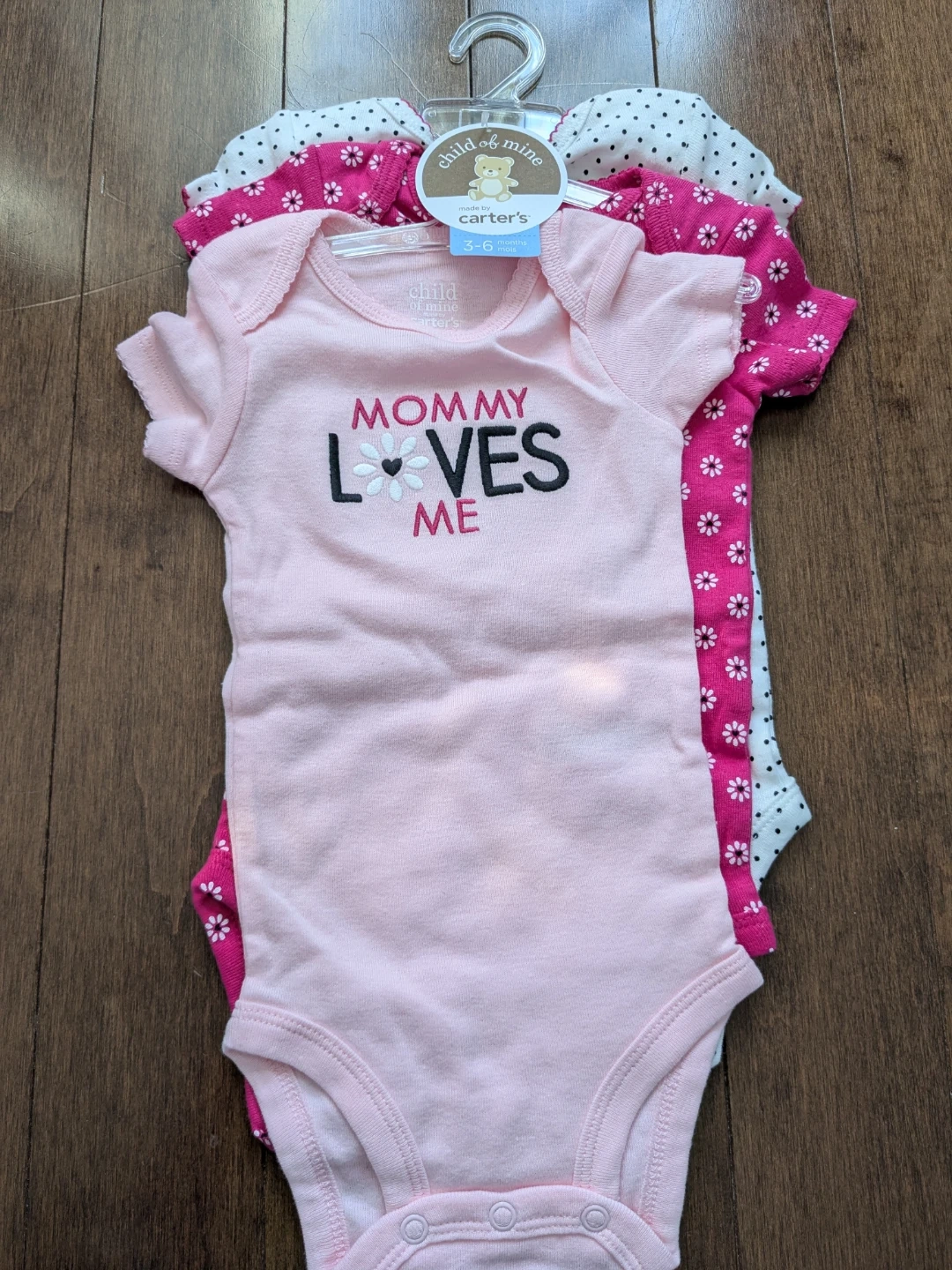 This is a pack of three baby bodysuits from Child of Mine by Carter's. They're sized for 3-6 months.