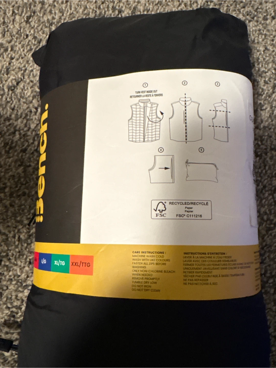 Bench packable vest in black. Made with Repreve recycled material. It's wind-resistant and water-repellent. Perfect for layering! Men’s size small