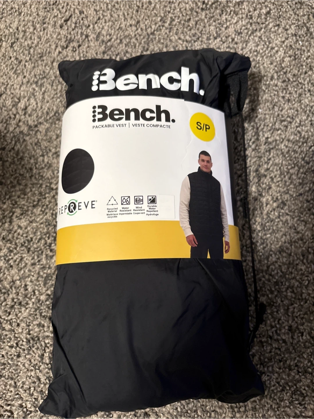 Bench packable vest in black. Made with Repreve recycled material. It's wind-resistant and water-repellent. Perfect for layering! Men’s size small
