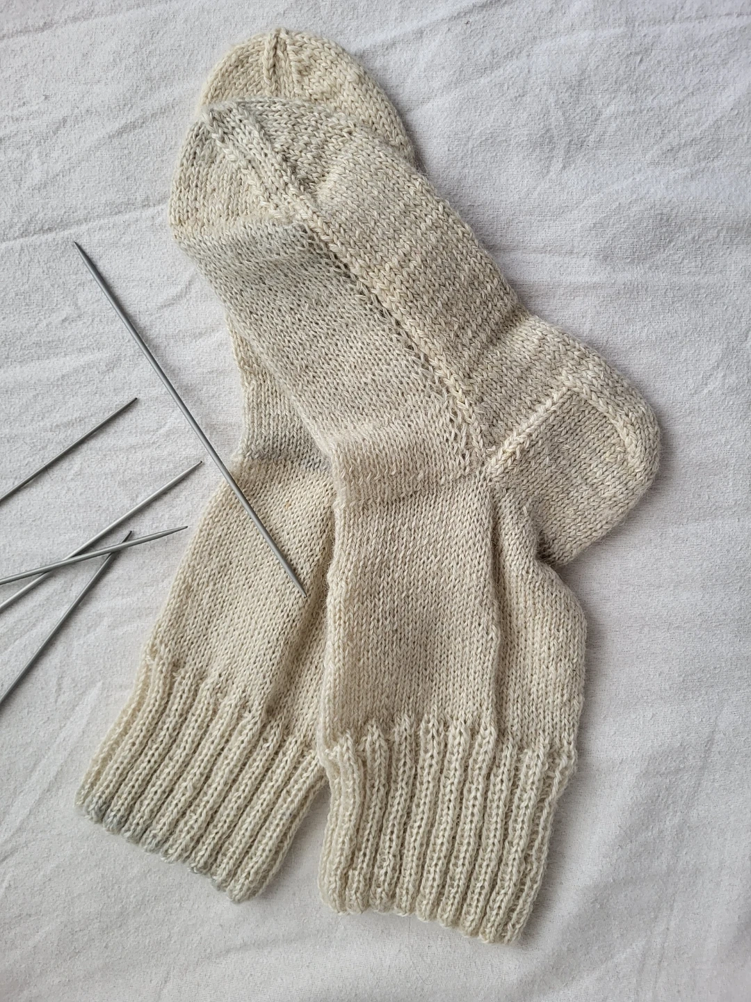 Hand-knitted angora wool socks slippers or over pants in a natural cream colour. These socks feature a wide ribbed cuff and detailed stitching along the leg. Made of wool and strangled other fibres for sole. Just finished.