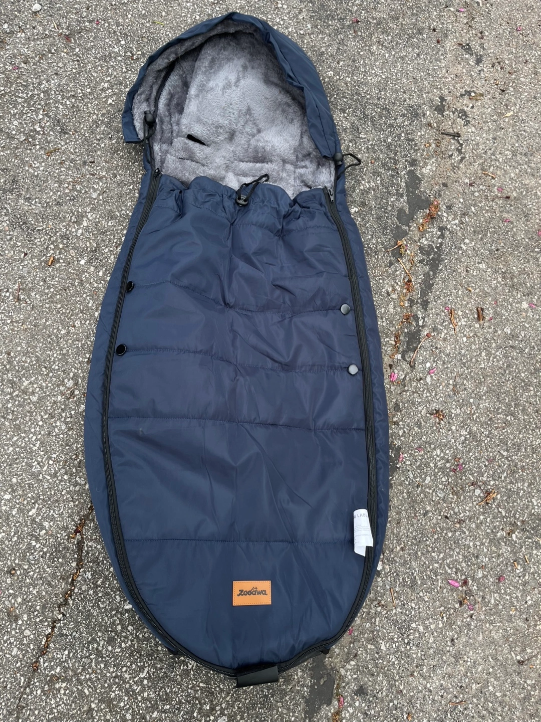 Stroller cozy bunting bag with a soft inner lining and a hood. Features a zipper closure, buttons, and a brand tag. Such a cozy place for a baby on a cold day.