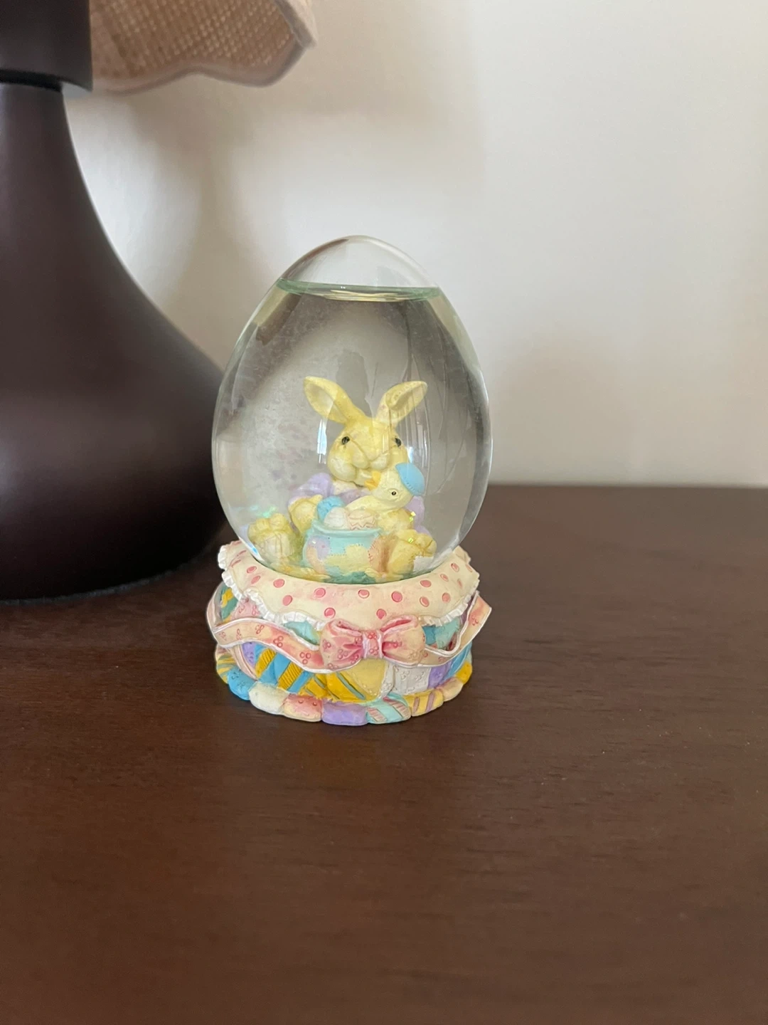 Cute Easter-themed snow globe featuring a yellow bunny and a chick inside an egg. It sits on a decorative base with pastel ribbons and polka dots. Perfect for springtime decor!