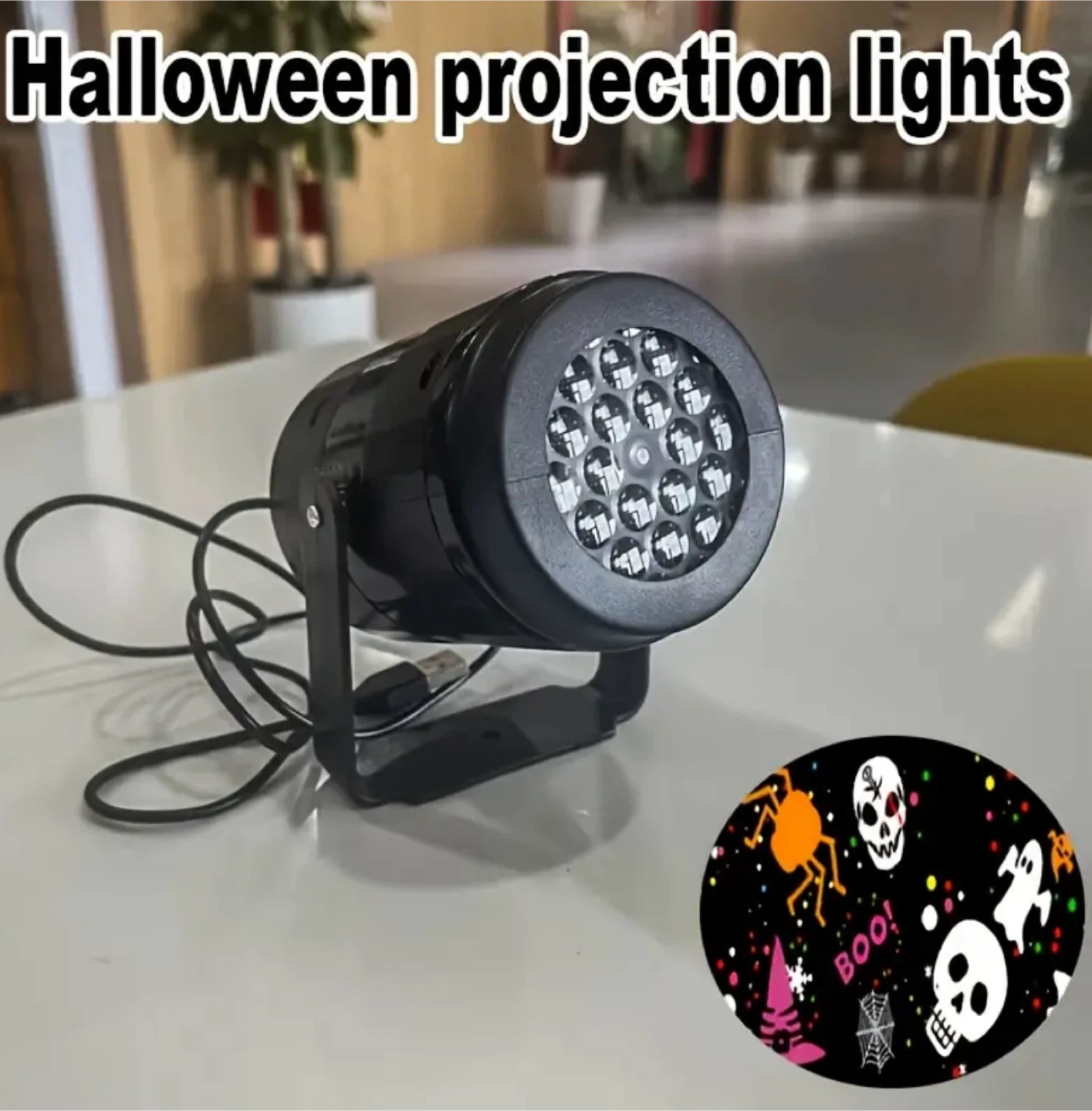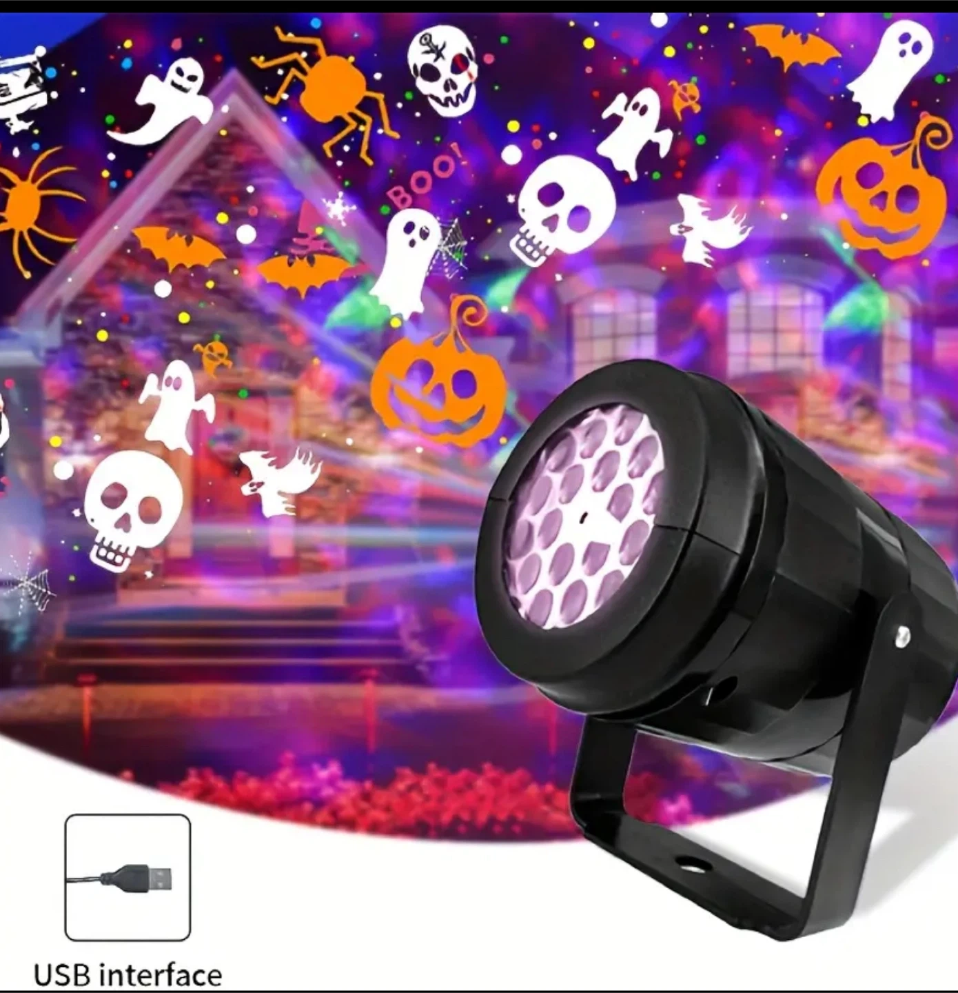 Get ready for Halloween with this fun projection light! It's USB powered, so it's easy to set up anywhere. Project spooky images like ghosts, pumpkins, and spiders onto your house or walls for a festive Halloween display