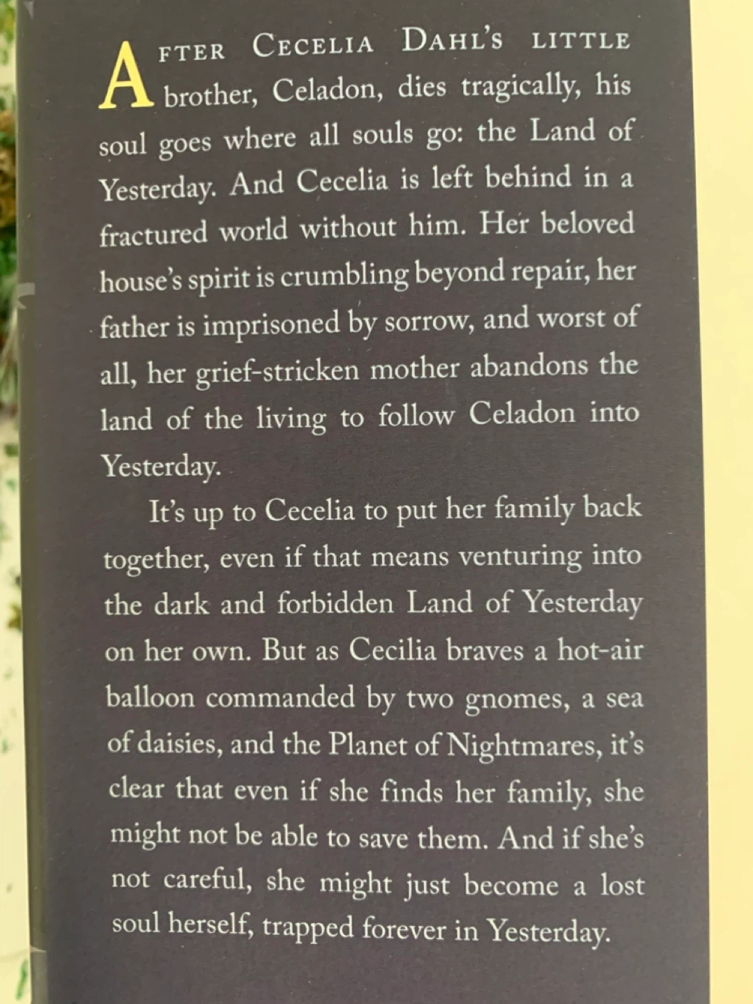A young adult fantasy novel. This book is about a girl named Cecelia who journeys into the Land of Yesterday to find her lost brother. It's filled with dark magic and adventure!