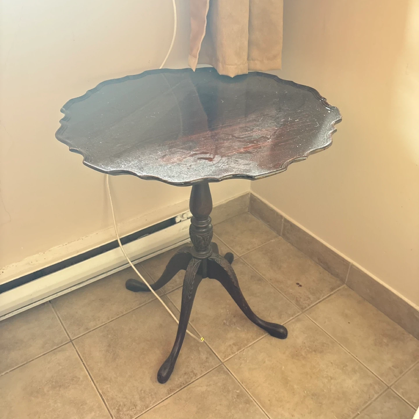 This is a charming antique wooden pedestal table with a carved base. Its scalloped edge top adds a decorative touch. It's a beautiful accent piece for any room.