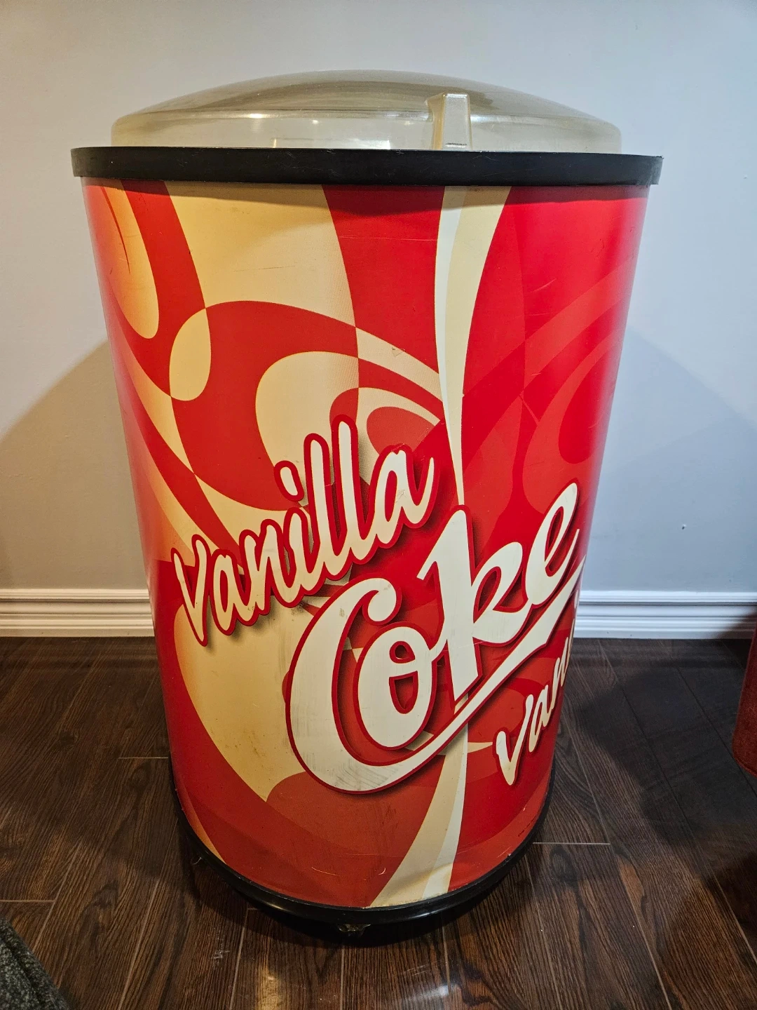Vintage Coca-Cola cooler with a "Vanilla Coke" design. It's a large capacity container, perfect for parties or collections. Includes the main cooler unit and lid.