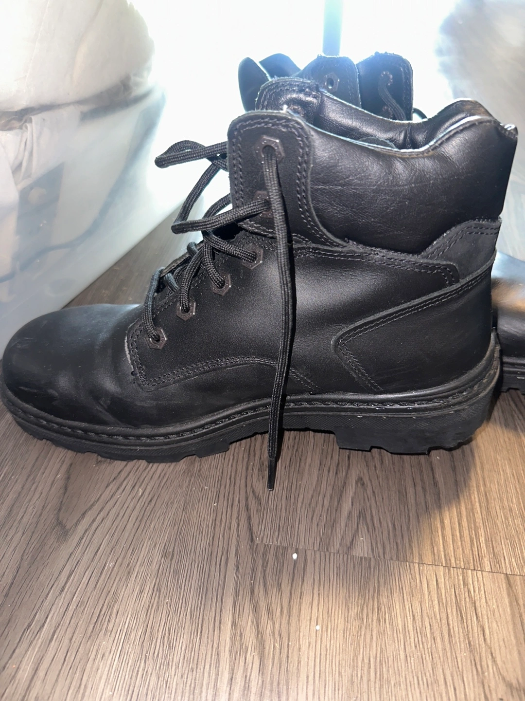 Pair of black leather work boots. Lace-up closure. Good condition. Size US 8, EU 42. Worn twice and left the job