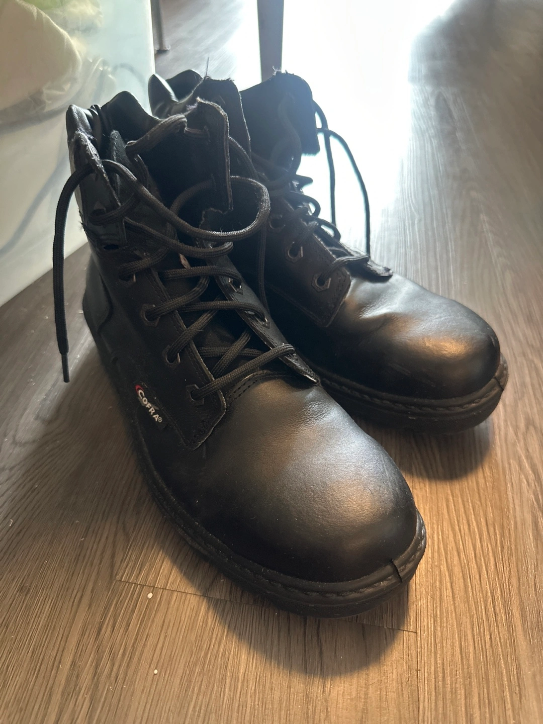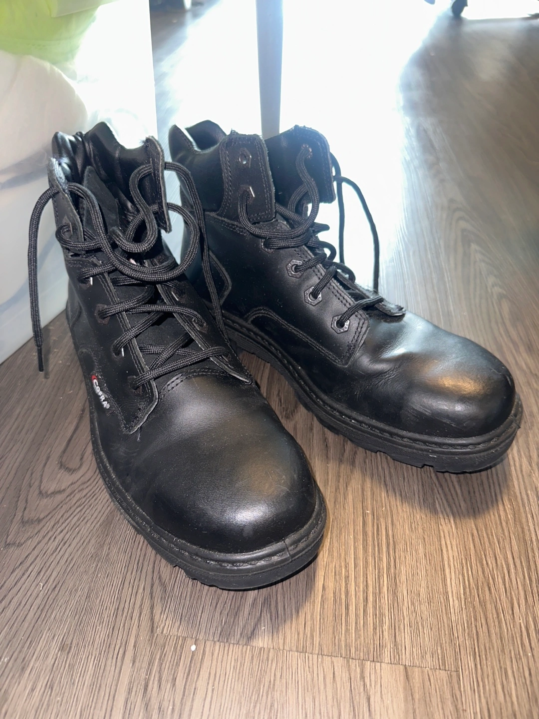 Pair of black leather work boots. Lace-up closure. Good condition. Size US 8, EU 42. Worn twice and left the job