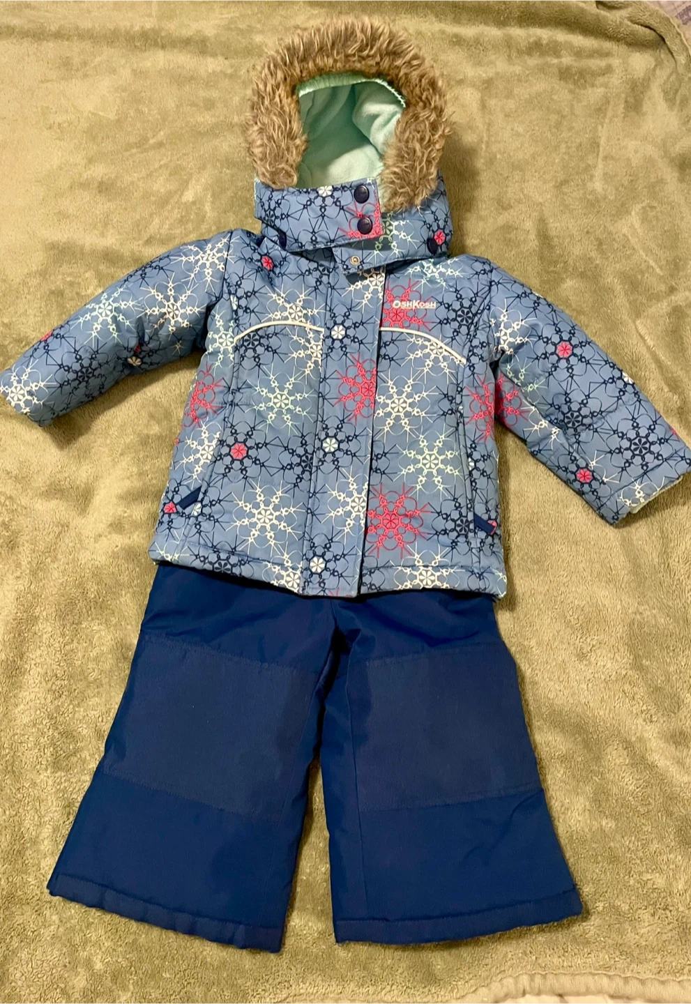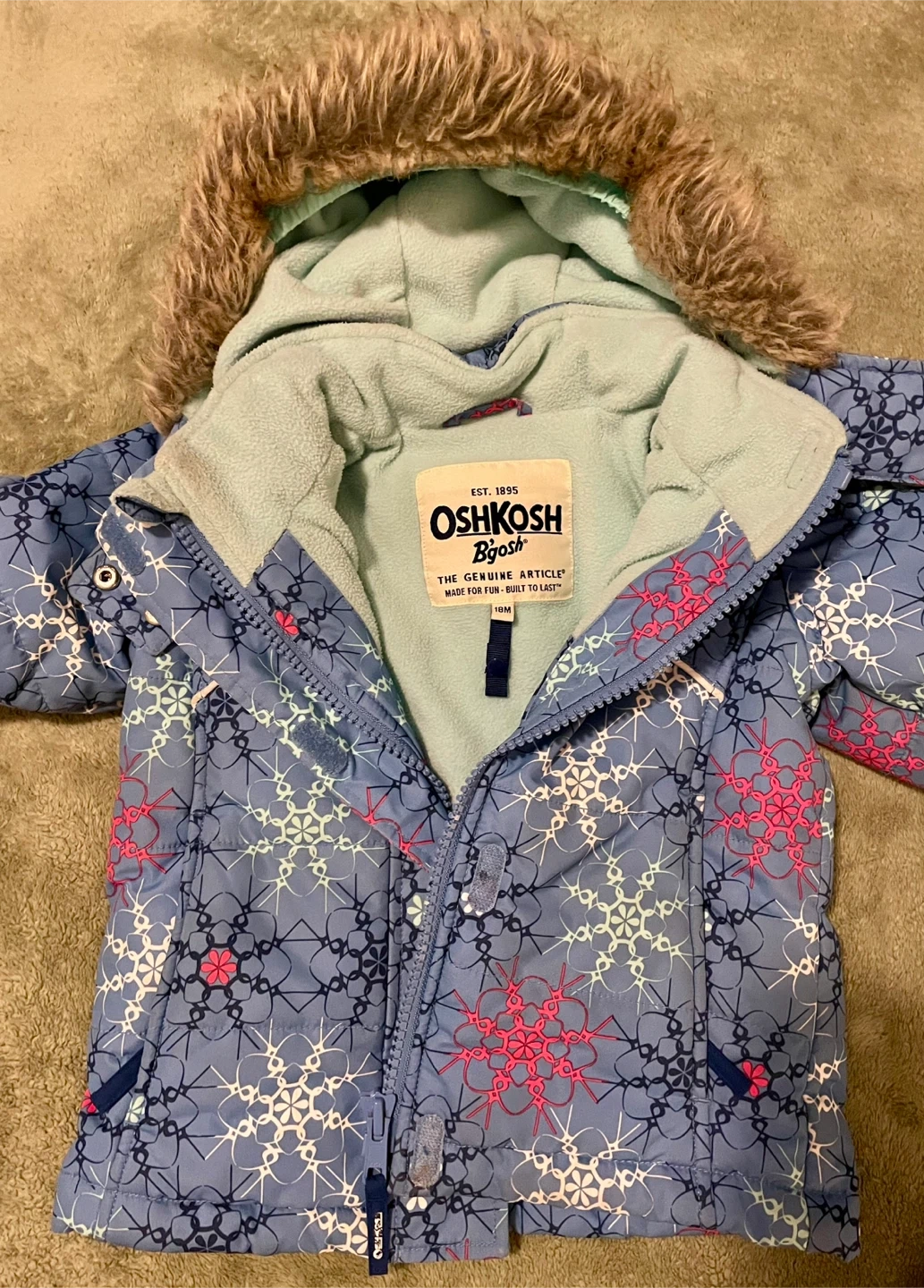 Adorable OshKosh Bgosh snowsuit, size 18M. It fit my daughter until 2-2.5 yrs. It's in great shape, with done minor wear and tear, and kept her very warm.