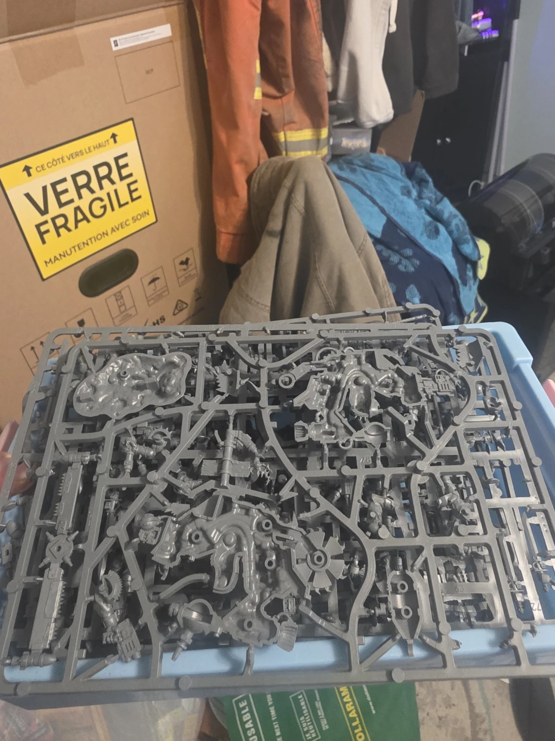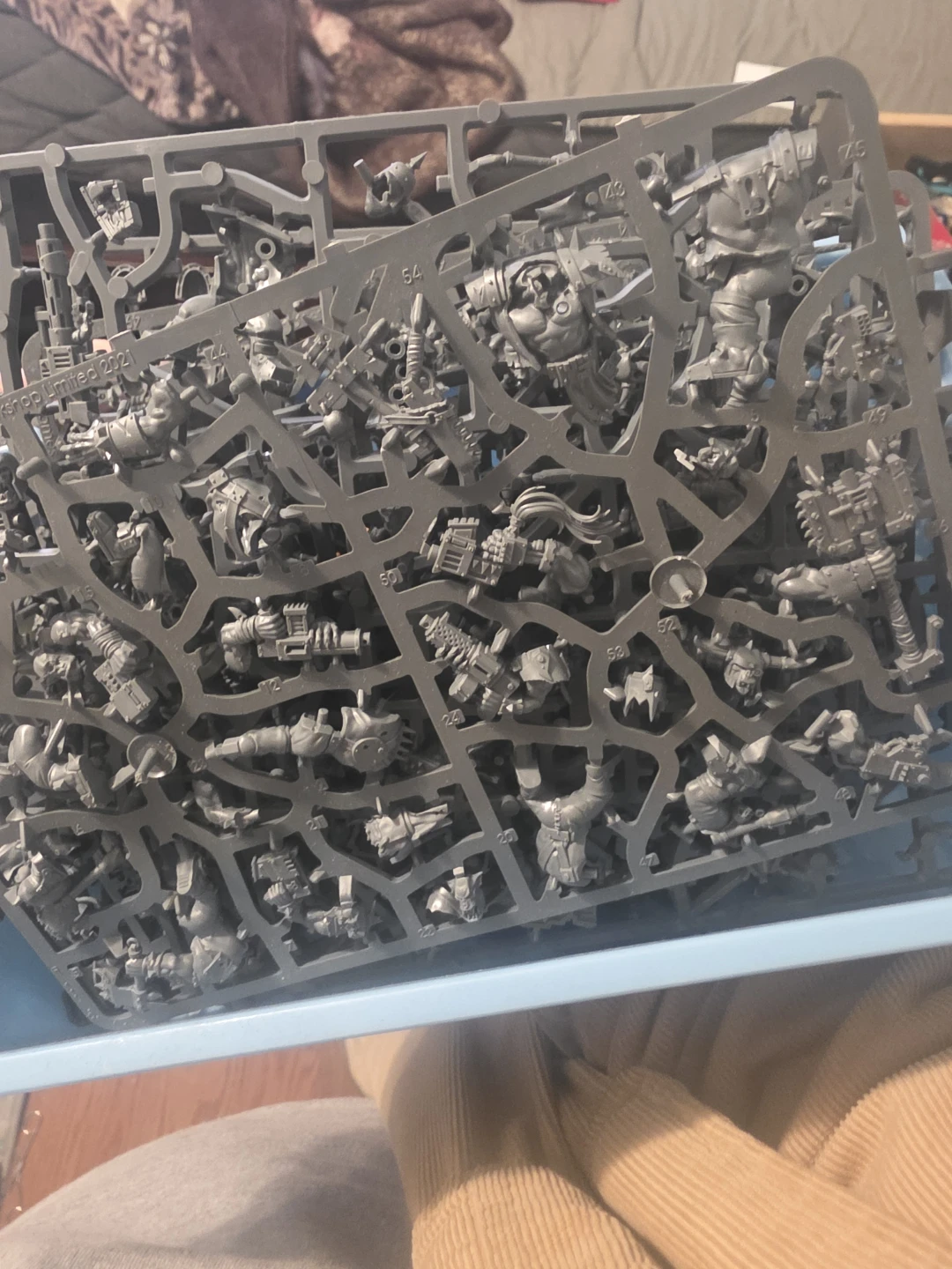 This is a plastic model kit sprue for Warhammer 40,000. It's grey plastic and contains numerous detailed parts for assembling miniatures. The sprue is uncut, ready for building.