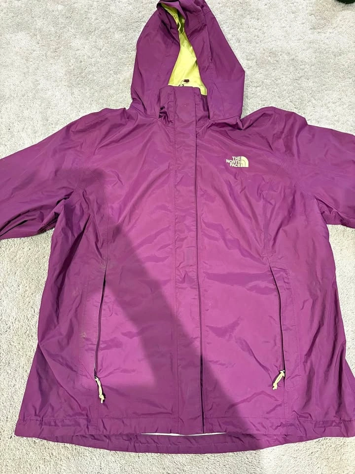 Lightweight The North Face jacket. Women's XL. Cool purple color with bright yellow lining. Has a hood and zippered pockets. Great for rainy days or just a light layer. Like new shape no rips or stains.