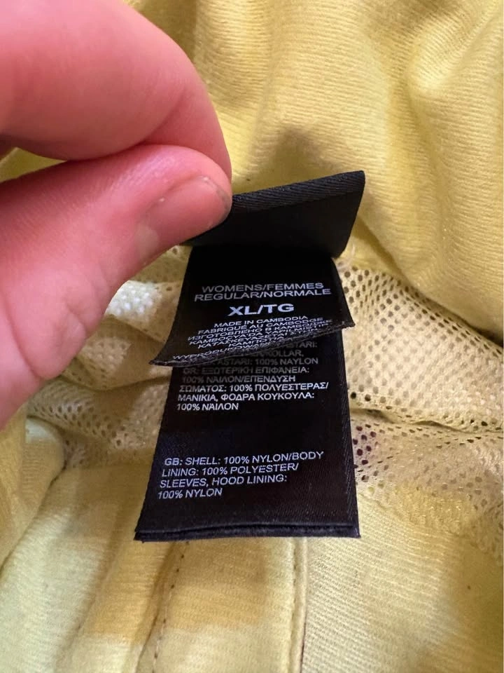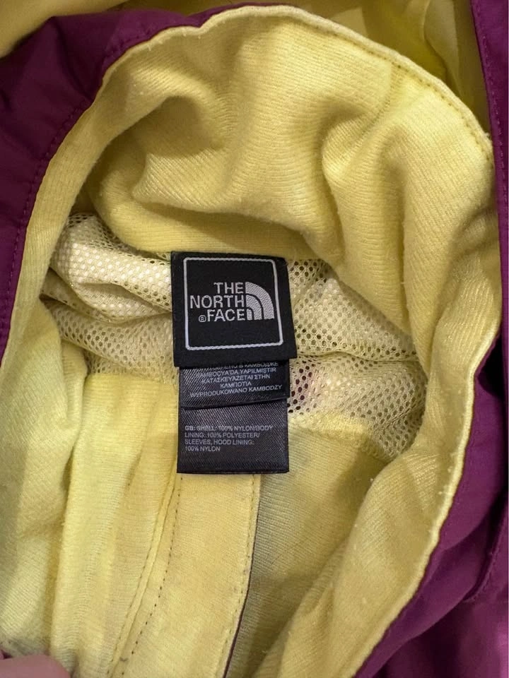 Lightweight The North Face jacket. Women's XL. Cool purple color with bright yellow lining. Has a hood and zippered pockets. Great for rainy days or just a light layer. Like new shape no rips or stains.