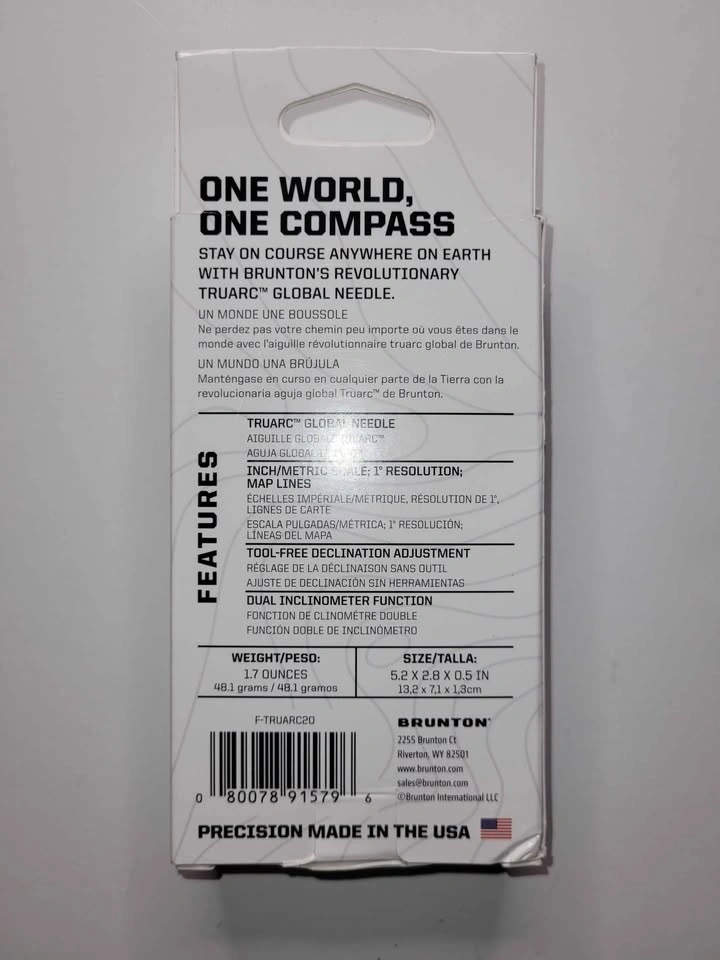Brand new Brunton TruArc 20 Mirrored Professional Compass. Has TruArc global needle, tool-free declination adjustment, and dual inclinometer function. Weighs 1.7 ounces and measures 5.2 x 2.8 x 0.5 inches. Made in the USA.