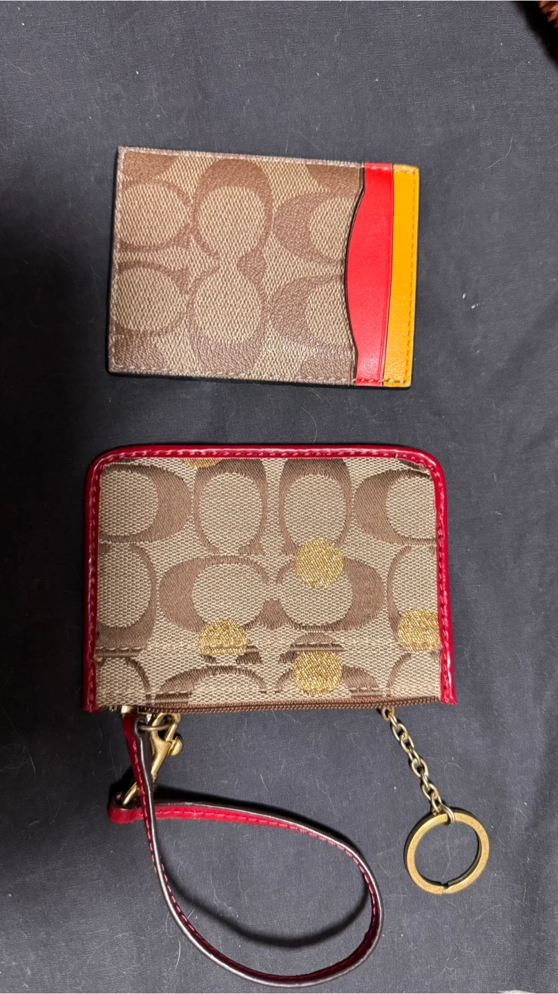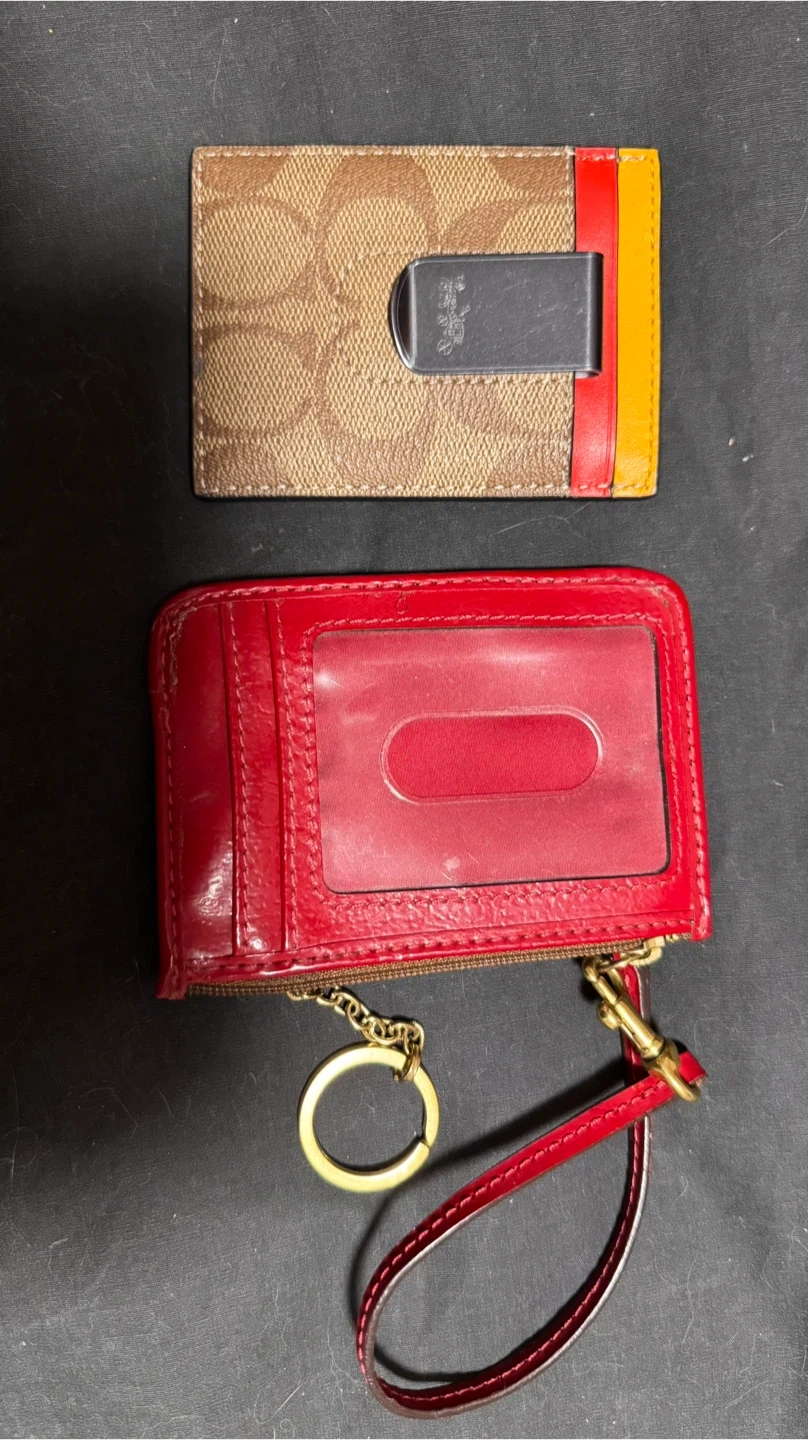 Two for one deal! Two coach wallets; 1 two sided cardholder with clip (2 slots each side) and mini red wristlet wallet with zipper and ID holder.