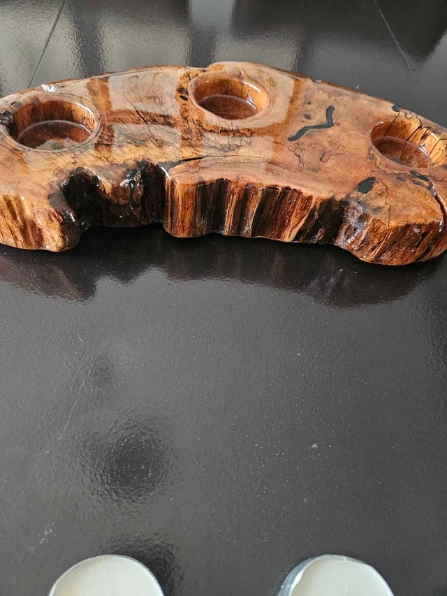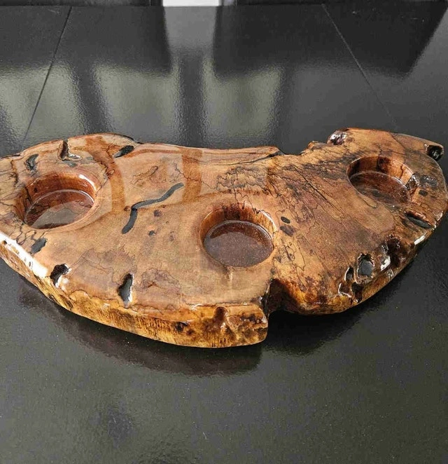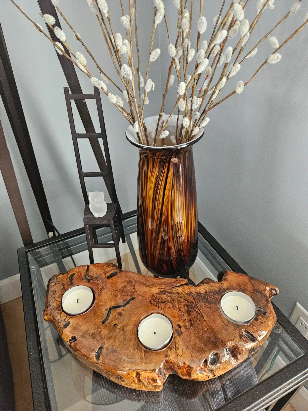 Add a touch of rustic charm with this unique, handmade burl wood candle centerpiece.