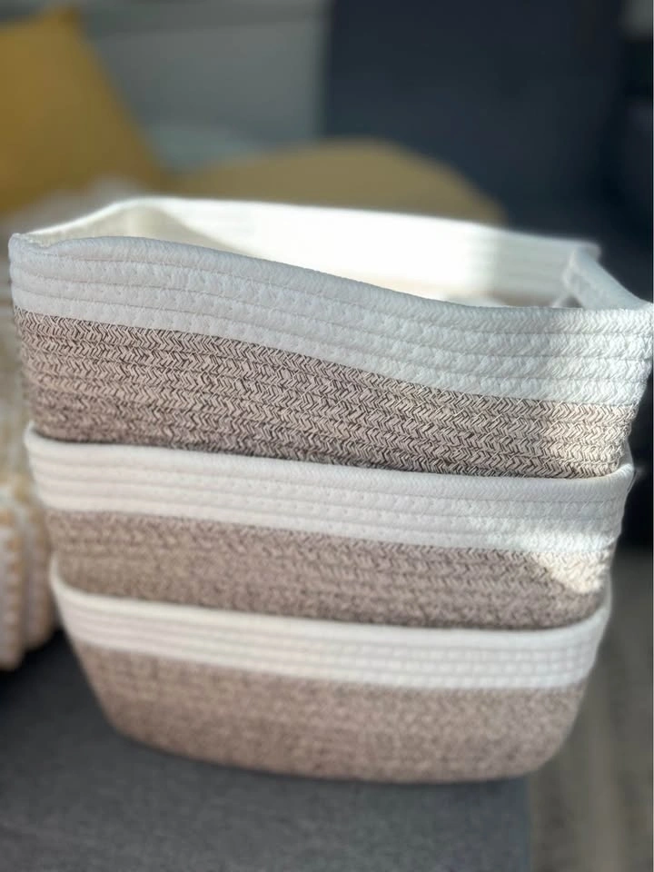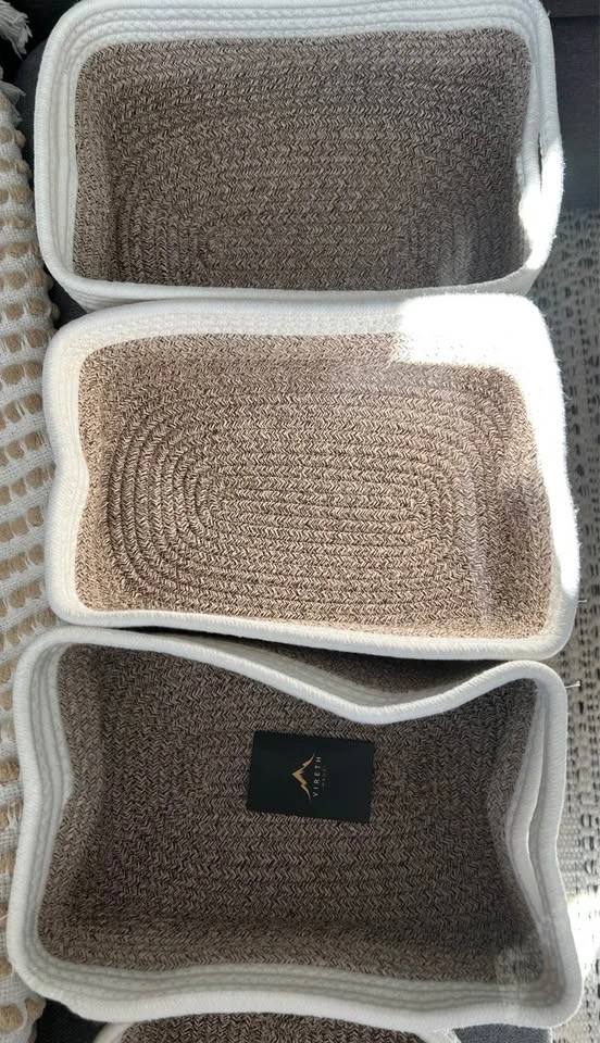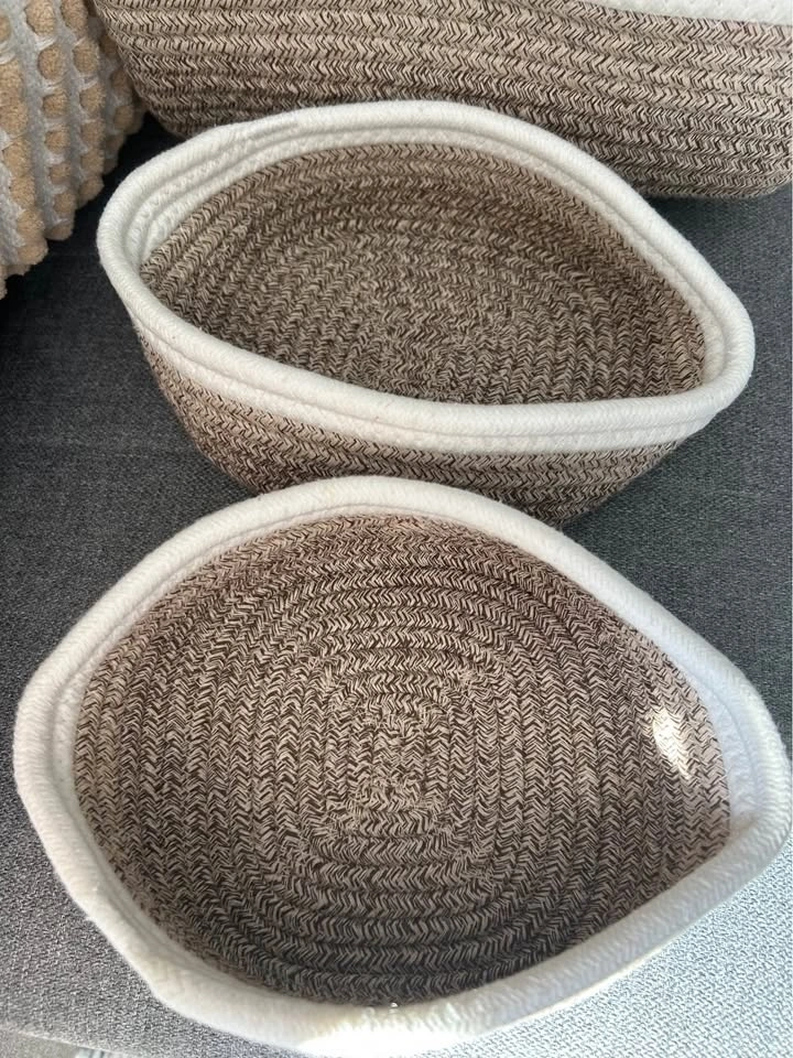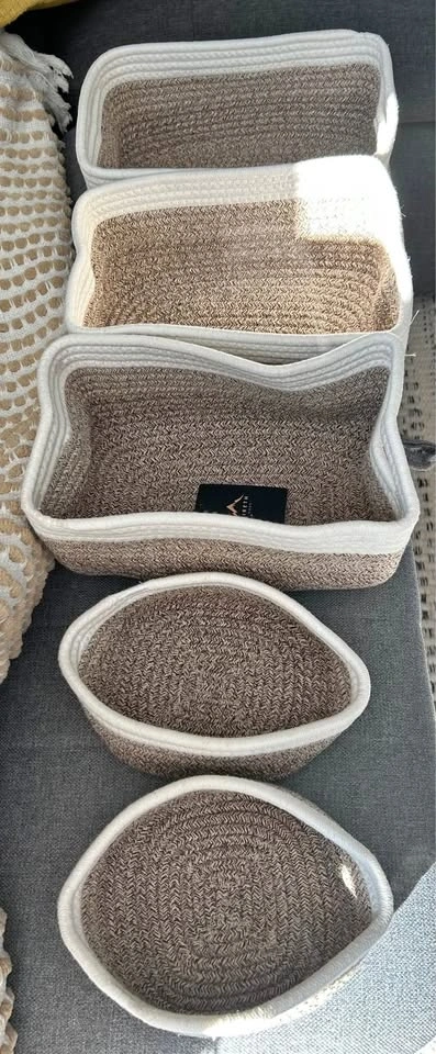 Brand-new baskets. The size of the 3 biggest ones: 29cm x 20.5cm x 14cm, 28cm x 19cm x 14cm (2 are the same size). The 2 smallest round ones are 17.5cm in diameter and 7.5cm in height. Cash only.