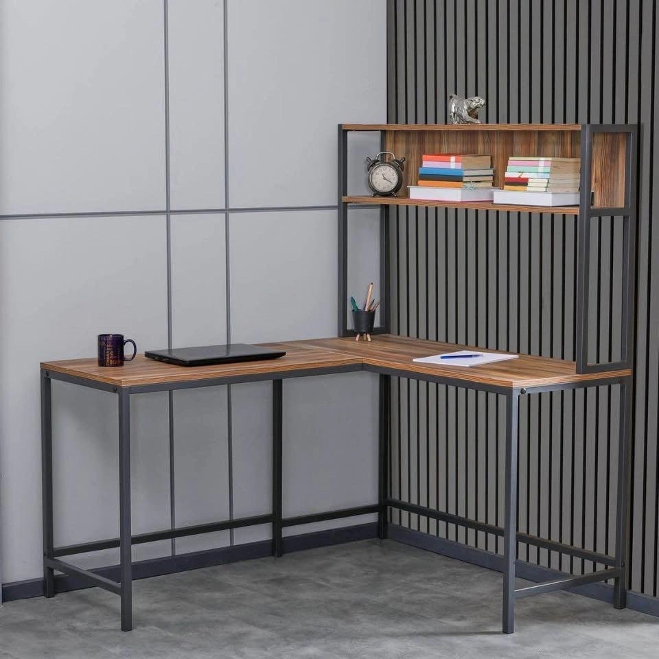 Modern L-shaped desk with built-in shelving, great for a home office, study room, or workspace. The wide design gives you plenty of room for your laptop, monitor, books, and other essentials, while the upper shelf keeps everything organized.