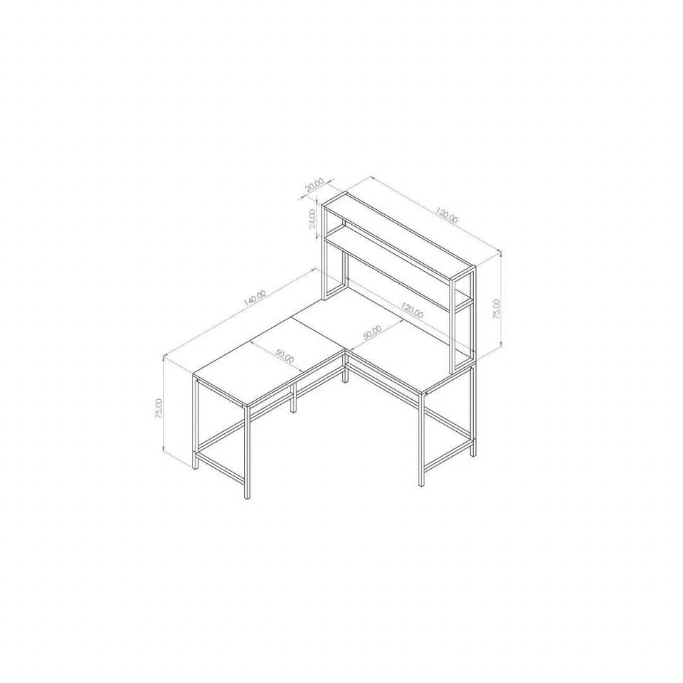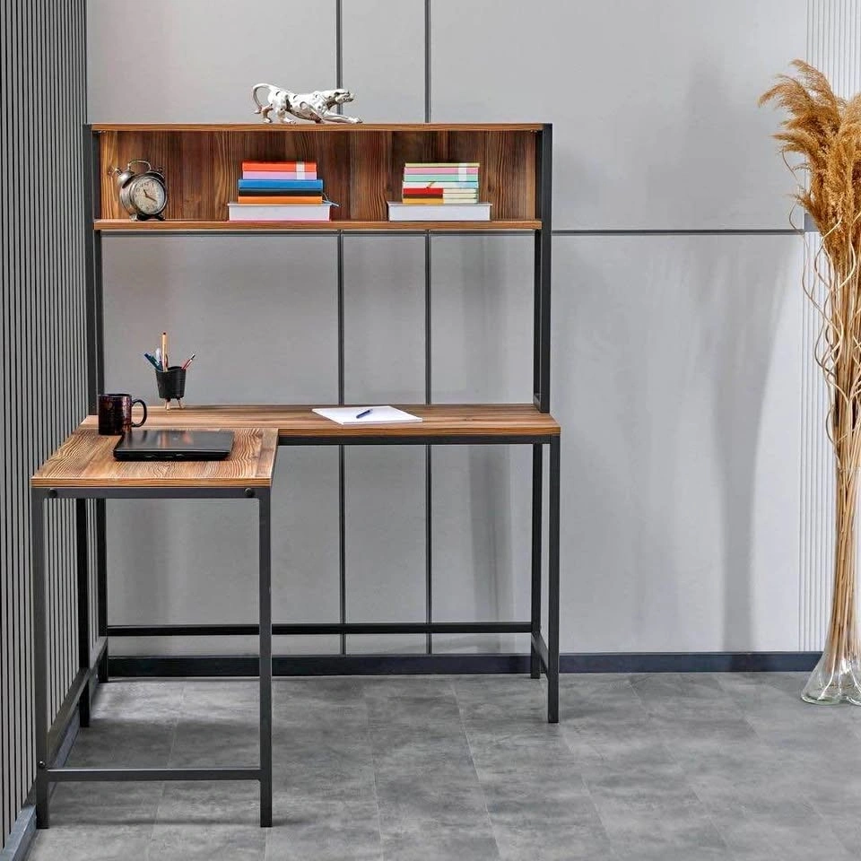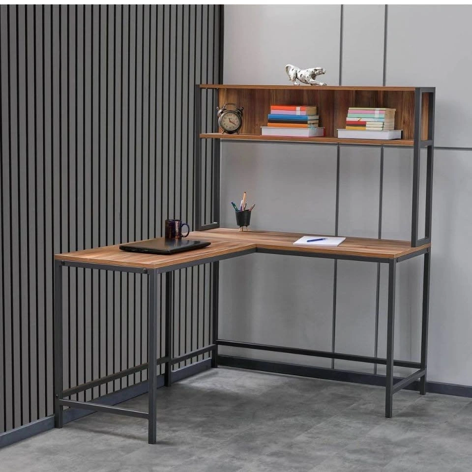Modern L-shaped desk with built-in shelving, great for a home office, study room, or workspace. The wide design gives you plenty of room for your laptop, monitor, books, and other essentials, while the upper shelf keeps everything organized.