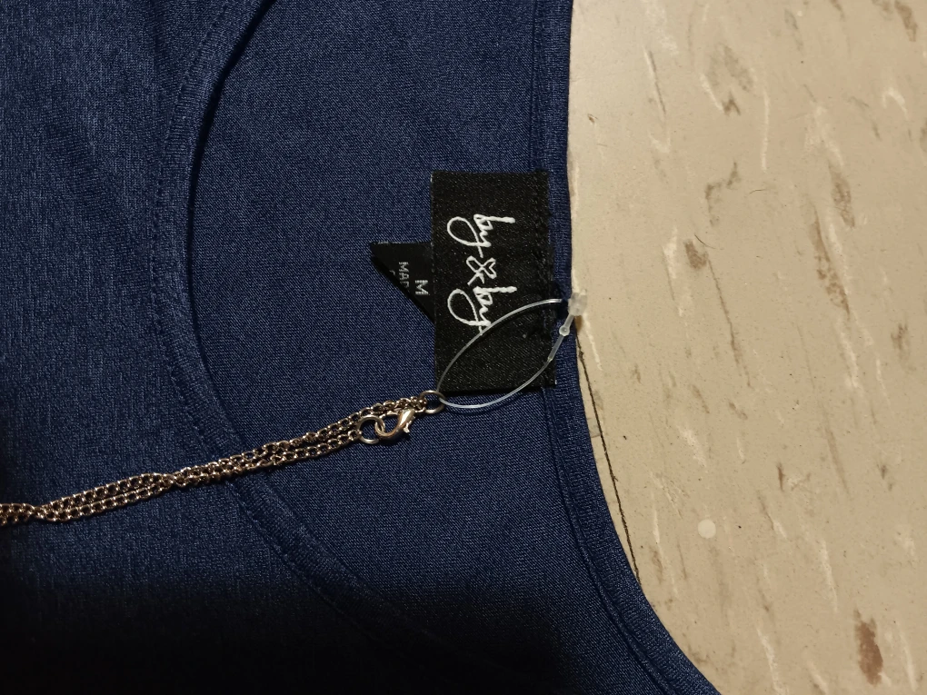I'm selling a Lay & Lay blue top in size medium. It has a unique design with cutouts on the sleeves and a zipper detail at the neckline. It's in great condition and ready for a new wardrobe!