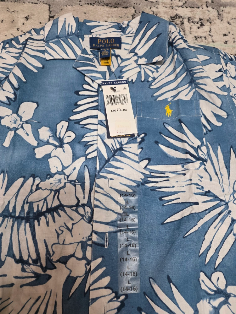 Polo Ralph Lauren short-sleeve button-up shirt with a blue and white floral print. Size L (14-16). Not worn at all. Its new with tags still on it.