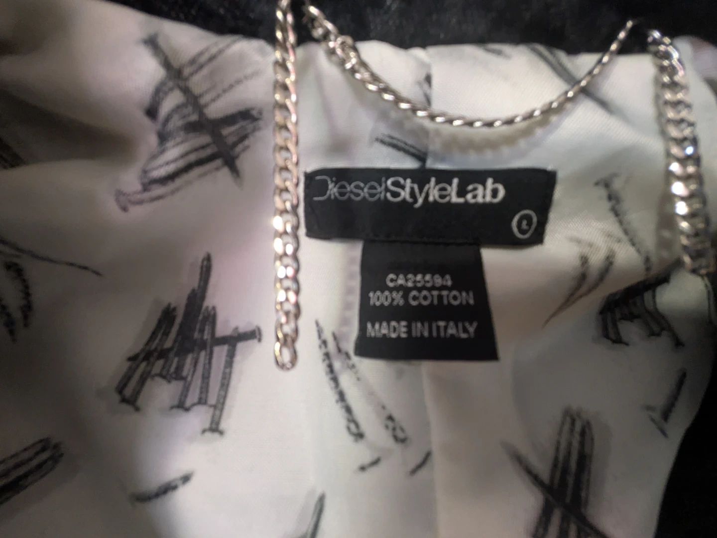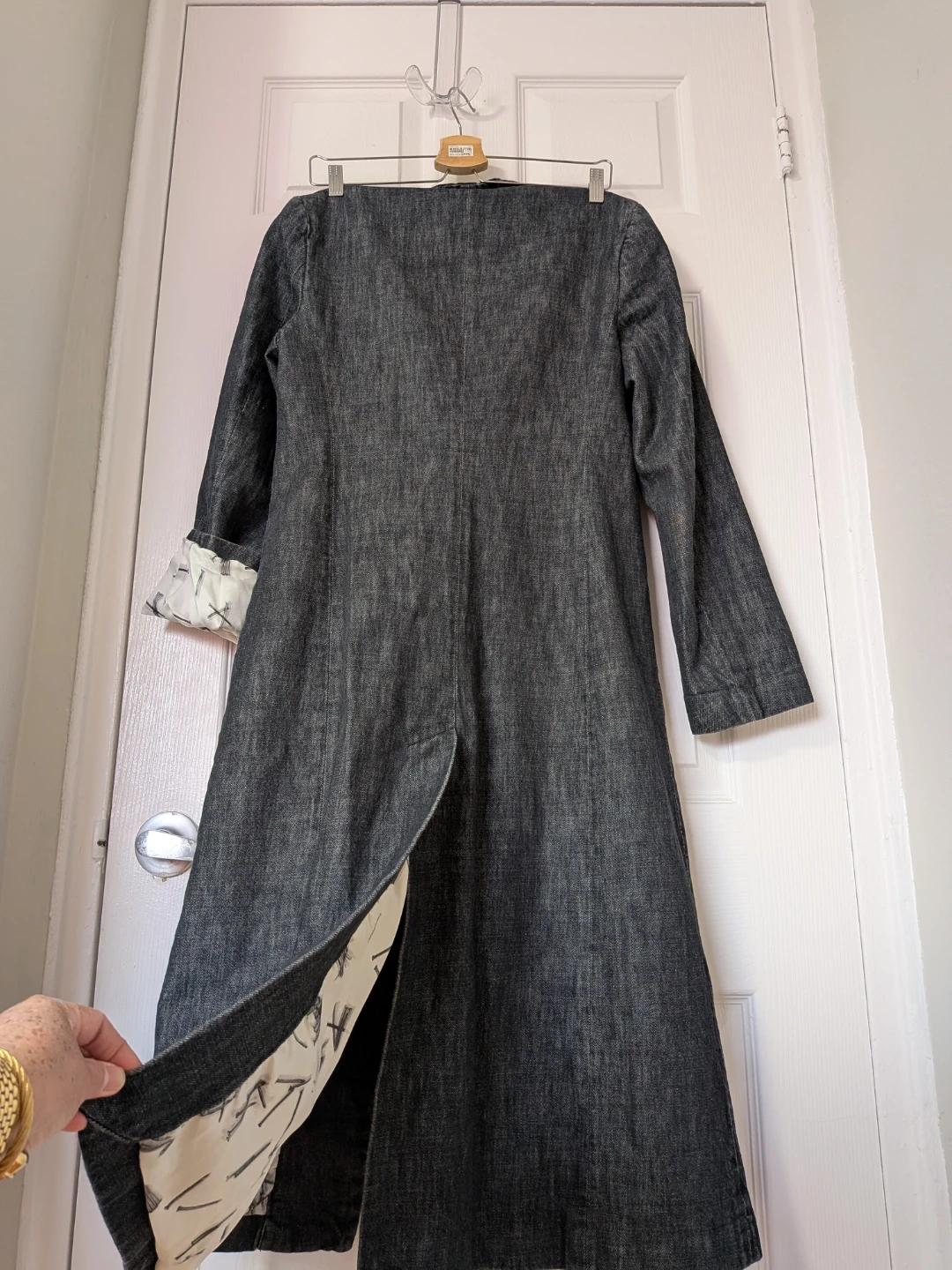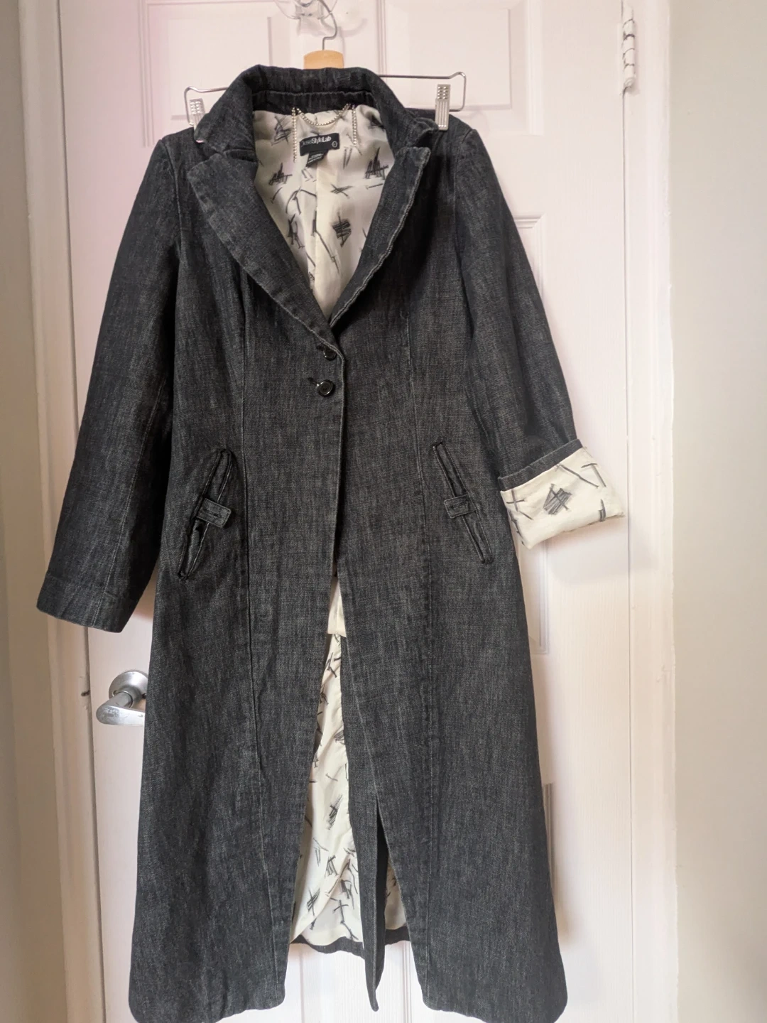 A dark wash denim long coat jacket from Diesel Style Lab. It features a stylish lining with a sketch print and made in Italy. 100% cotton material. Great for layering!