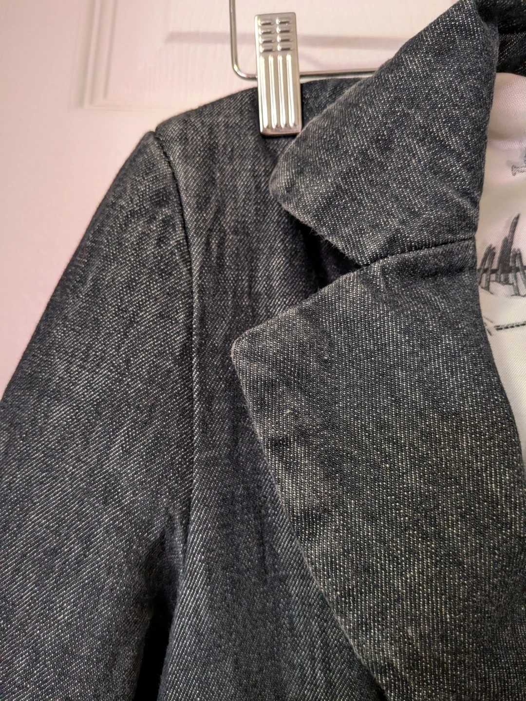 A dark wash denim long coat jacket from Diesel Style Lab. It features a stylish lining with a sketch print and made in Italy. 100% cotton material. Great for layering!