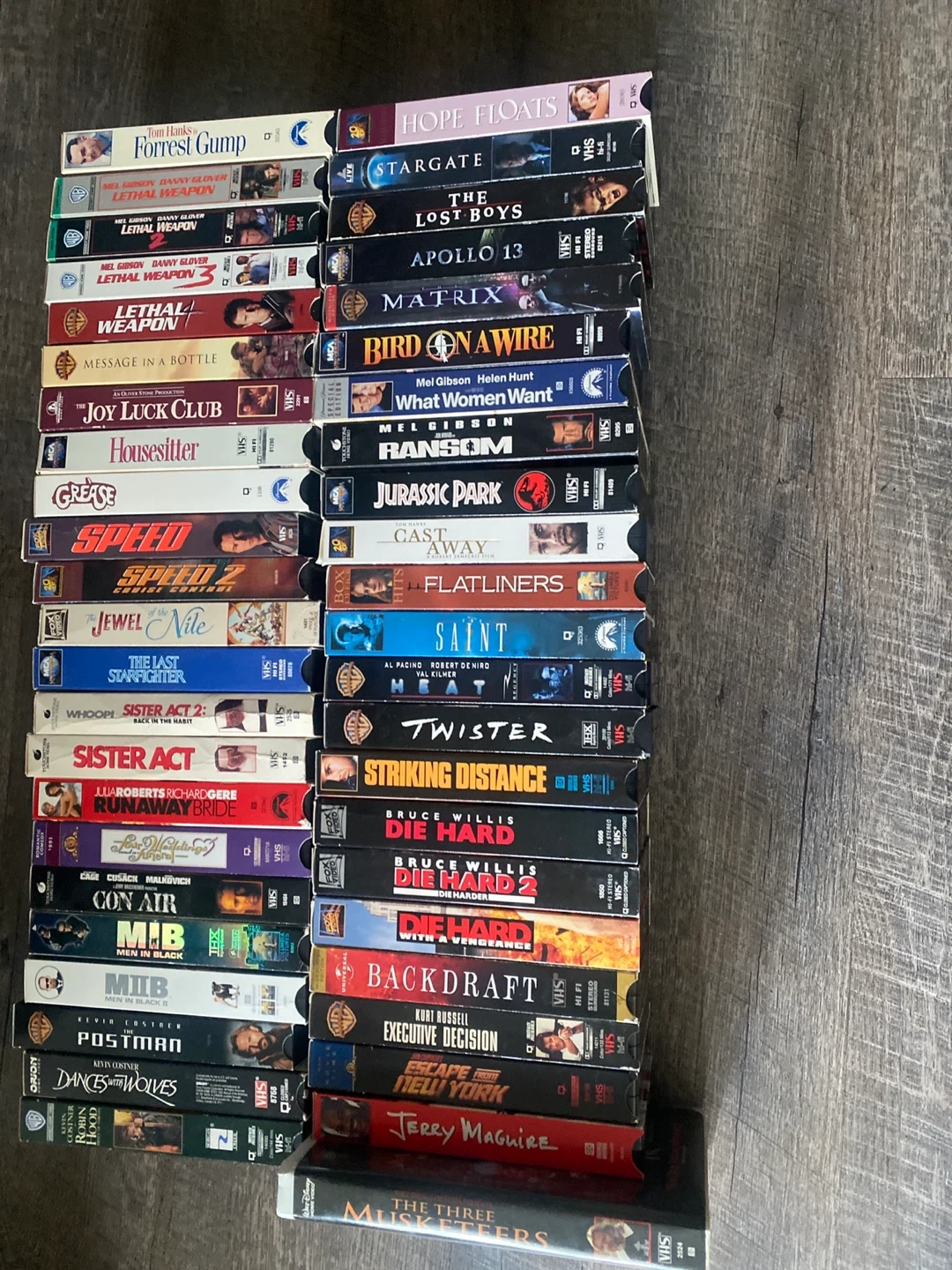 Collection of VHS movies includes action, comedy, and drama genres. Titles such as Lethal Weapon, Matrix, Jurassic Park, and Die Hard are present. Tapes are in VHS format. It's a great collection for movie enthusiasts!
