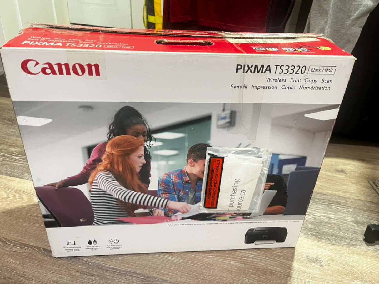 New Canon PIXMA TS3320 printer. It is wireless, has print, copy, and scan functions. Still in original box, used few times for scanning only, ink not included