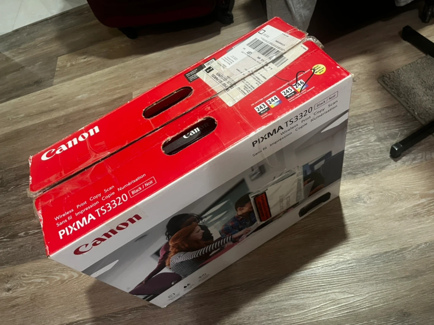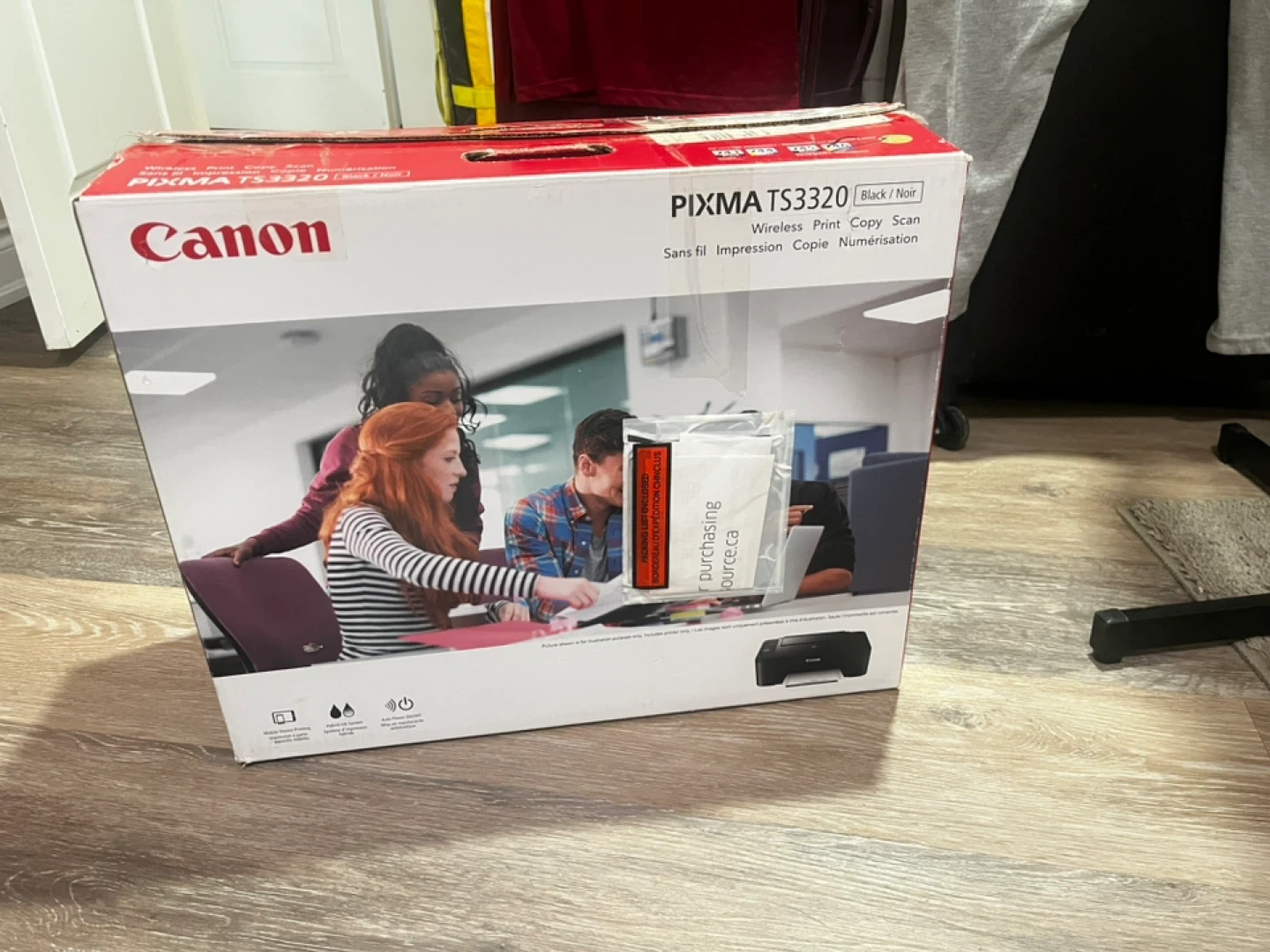 New Canon PIXMA TS3320 printer. It is wireless, has print, copy, and scan functions. Still in original box, used few times for scanning only, ink not included